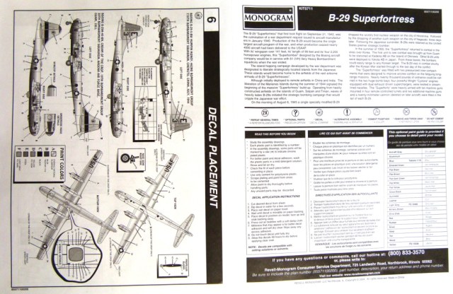 Ну а теперь о самой модели. Коробка размерами 40х70см из достаточно плотного картона, внутри лежит 7 литников с деталями 1 литник с остеклением, декаль и книжка инструкция. Все аккуратно запаяно в отдельные пакеты, инструкция достаточно информативная и четкая декаль дана на два вида самолета. Сами литники достаточно четкие без облоя, утяжин и прочего, вполне качественно отлиты, НО расшивка конечноже внешняя. В наборе присутствует ядерная бомба так что можно собрать тот самый самолет с которого были сброшены бомбы на Хиросиму и Нагасаки. Полностью дана внутрянка самолета, не только кабина но и фюзеляжа и бомбо отсека.