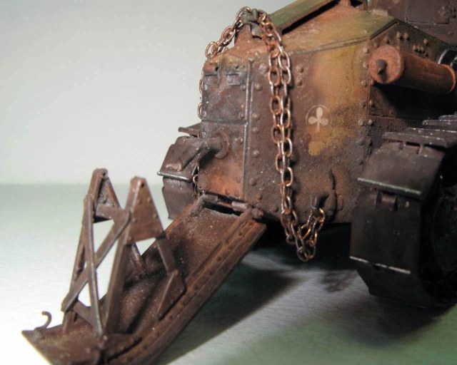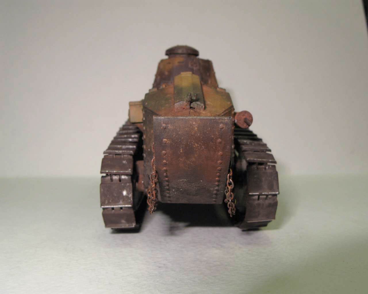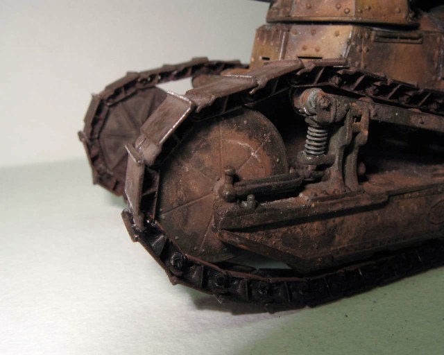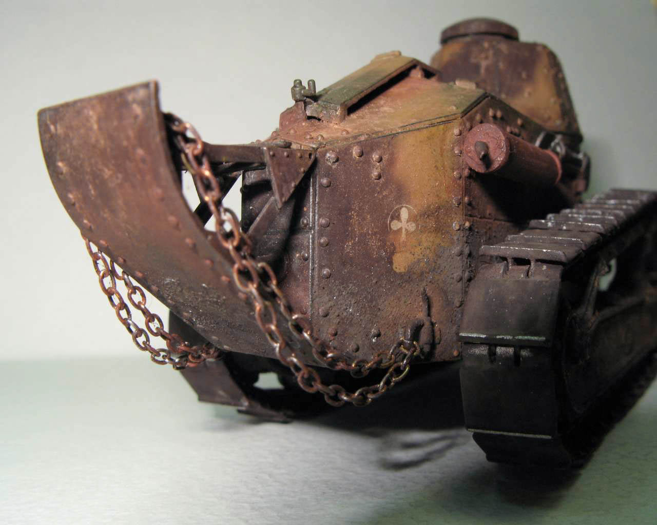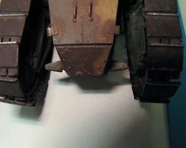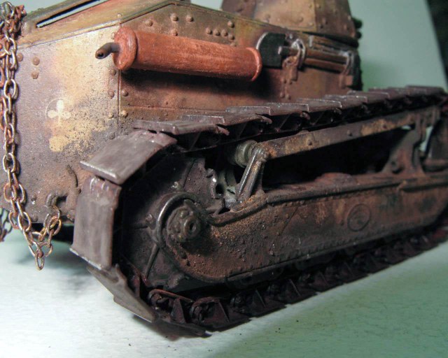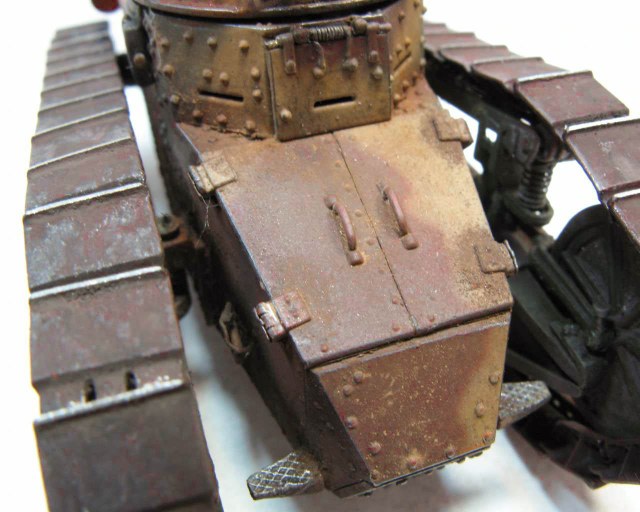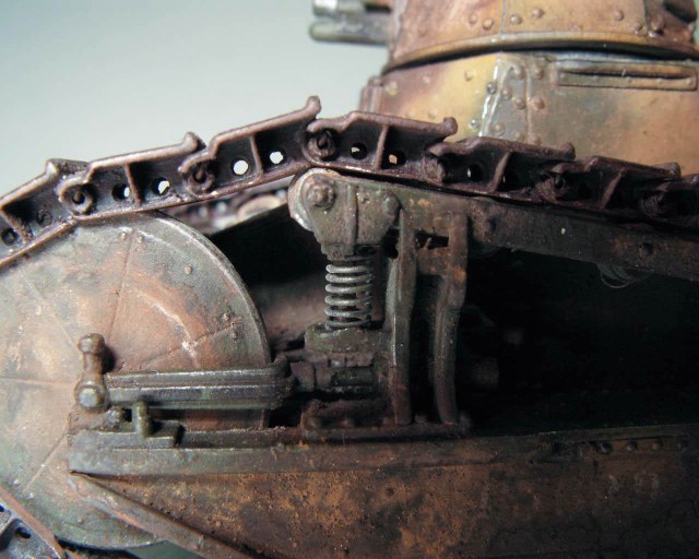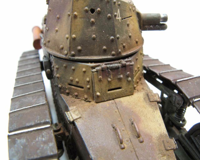Над моделью пришлось попыхтеть. Ушло 2 пакета заклепок и один противопульных болтов от МастерКлаб. Проклепан весь танк. Использована цепь, заменены ручки и крепежи. Хвост выполнен съемным, смотровой люк водителя открывается. Ходовая часть полностью подвижная и рабочая (использованы пружины), одеты гусеницы от Фриул. Исправлены многие косяки в матчасти (подробности в сказке).