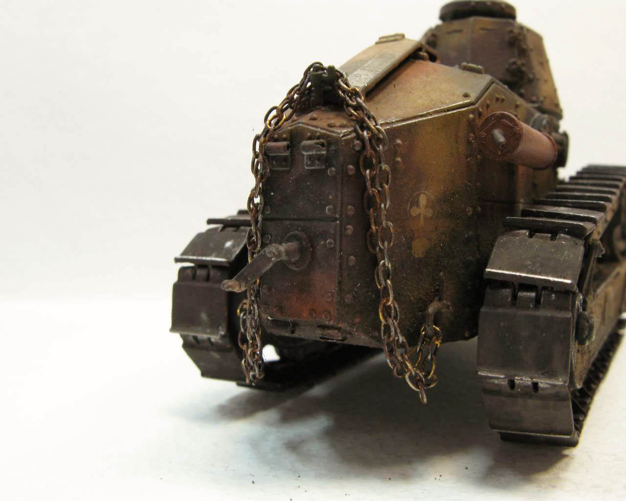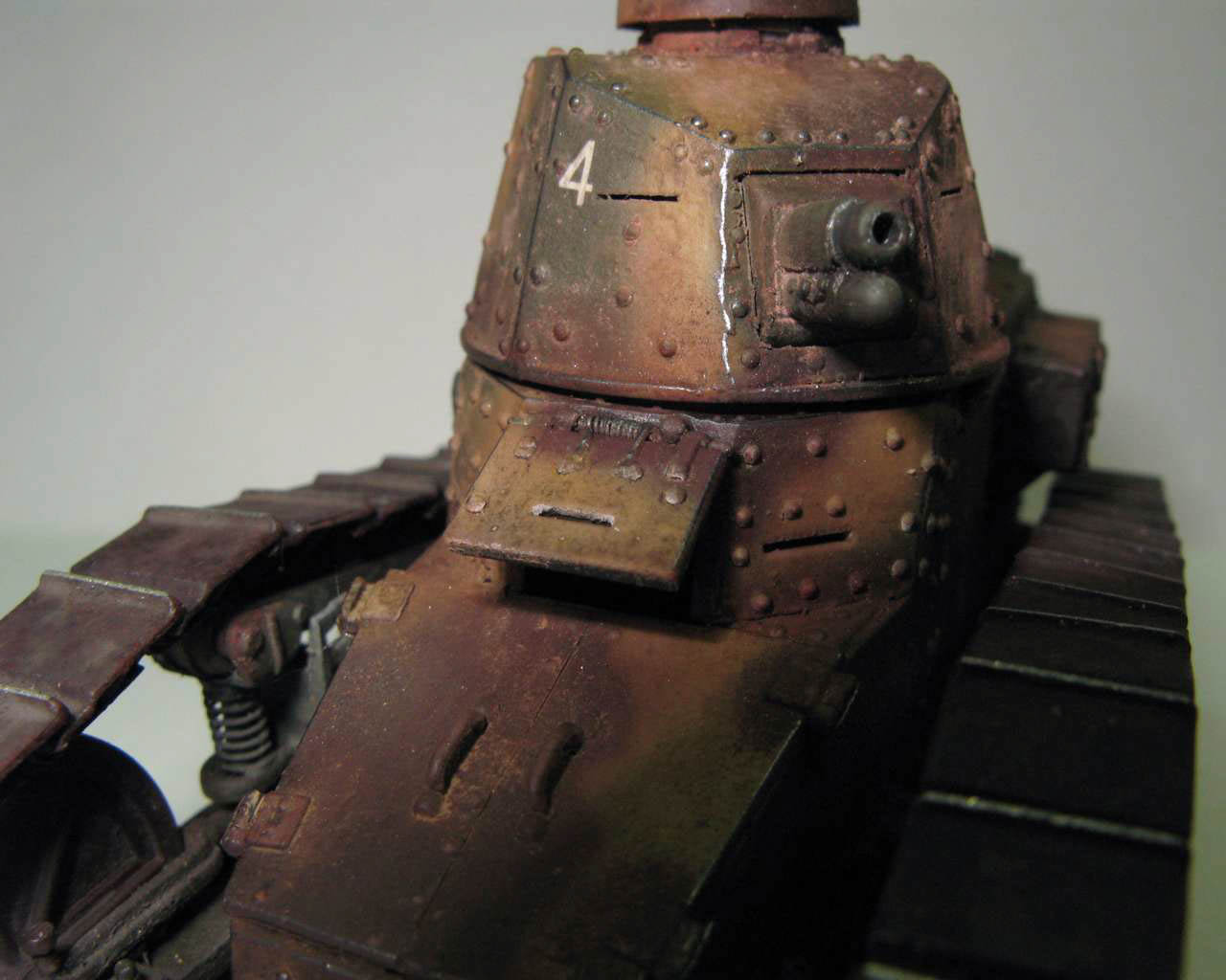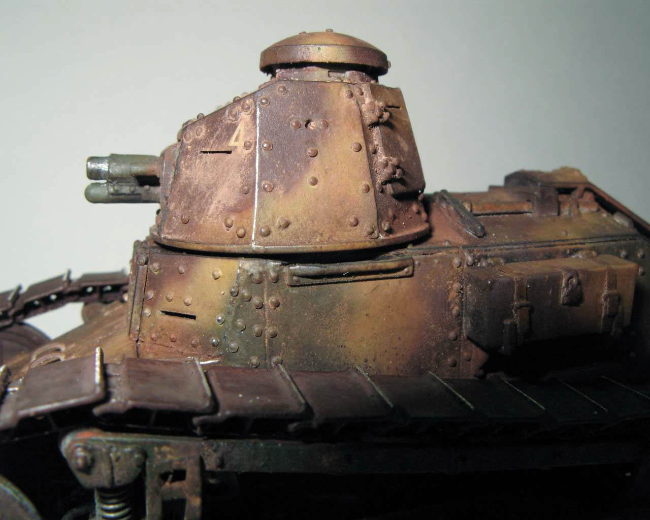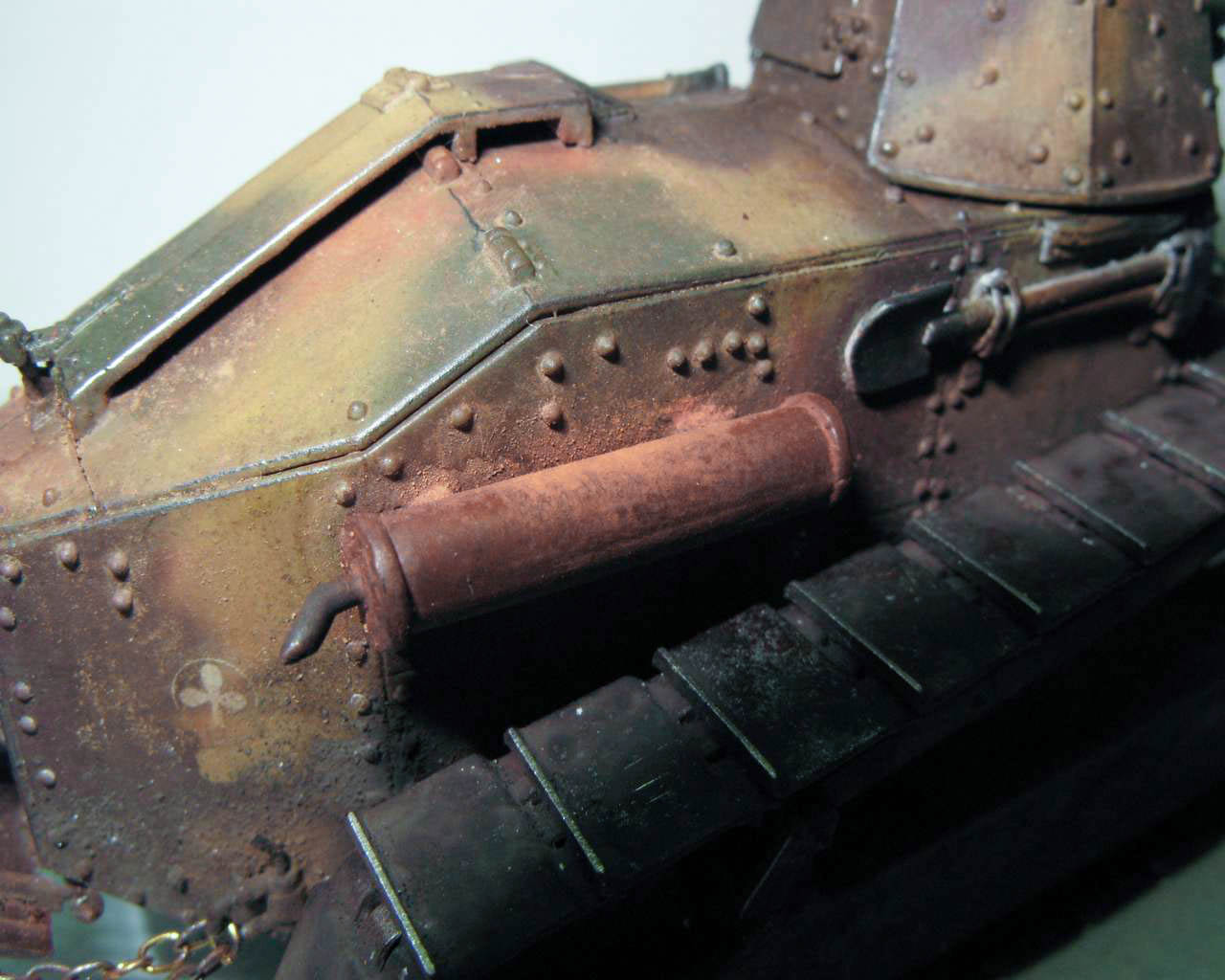 Над моделью пришлось попыхтеть. Ушло 2 пакета заклепок и один противопульных болтов от МастерКлаб. Проклепан весь танк. Использована цепь, заменены ручки и крепежи. Хвост выполнен съемным, смотровой люк водителя открывается. Ходовая часть полностью подвижная и рабочая (использованы пружины), одеты гусеницы от Фриул. Исправлены многие косяки в матчасти (подробности в сказке).