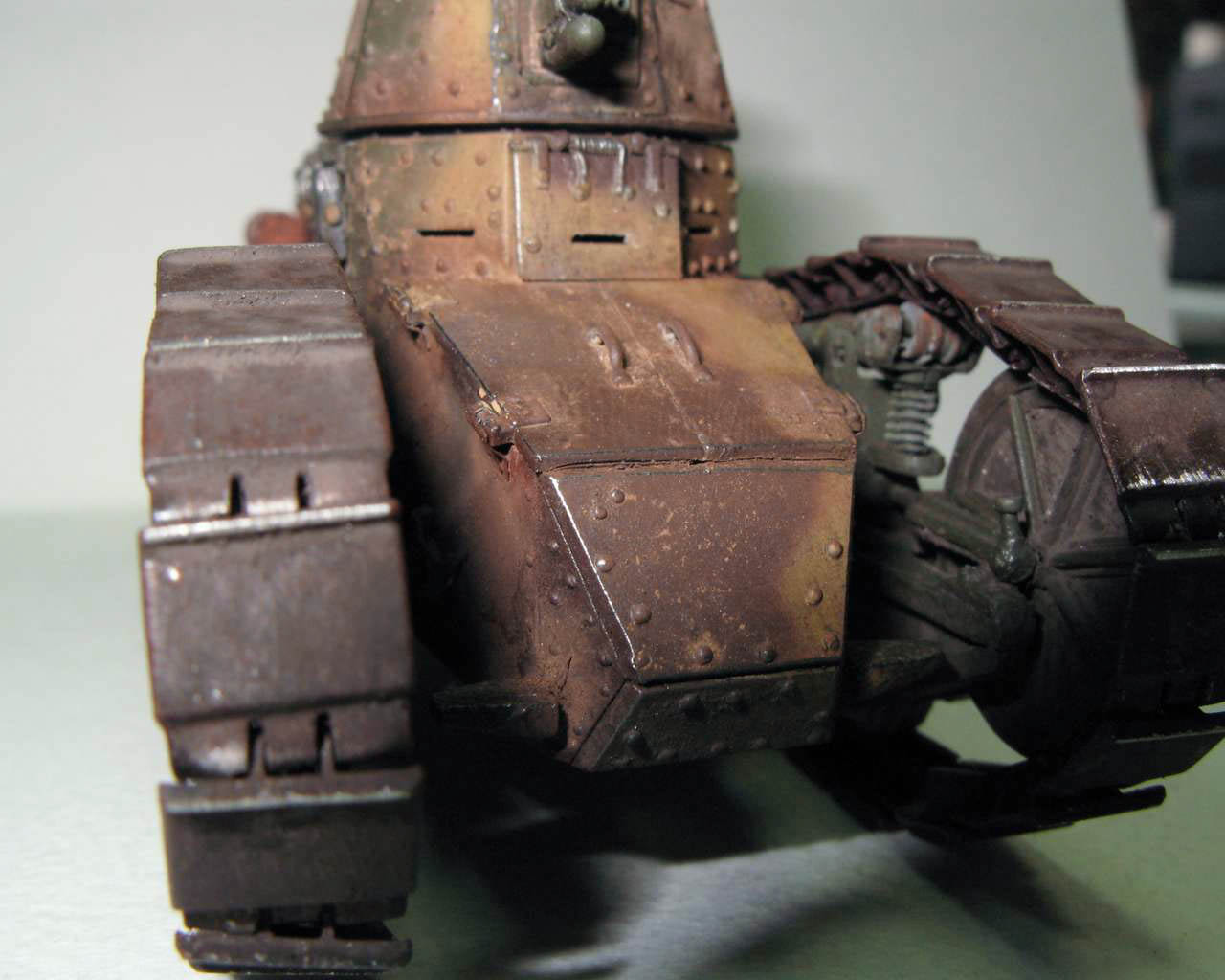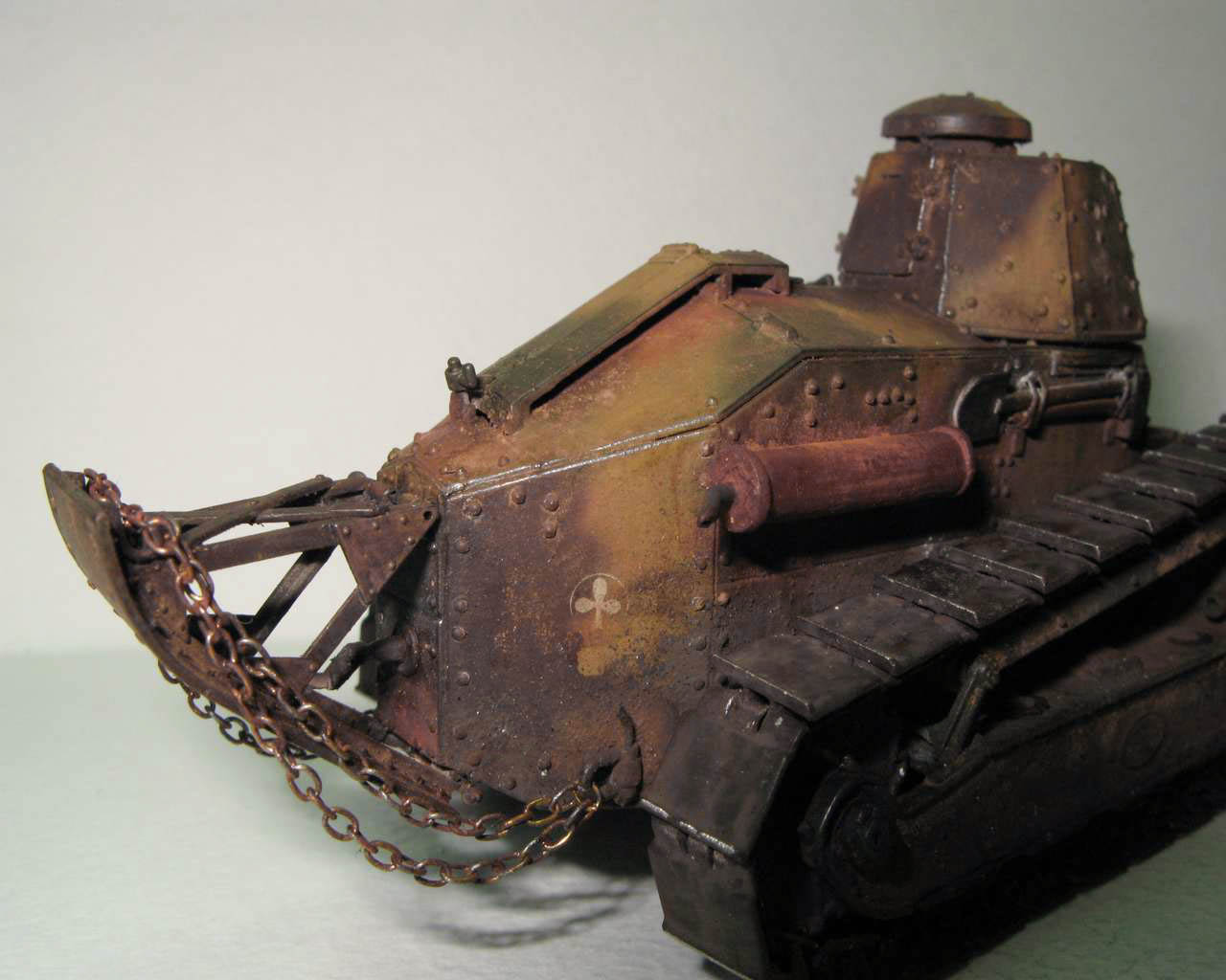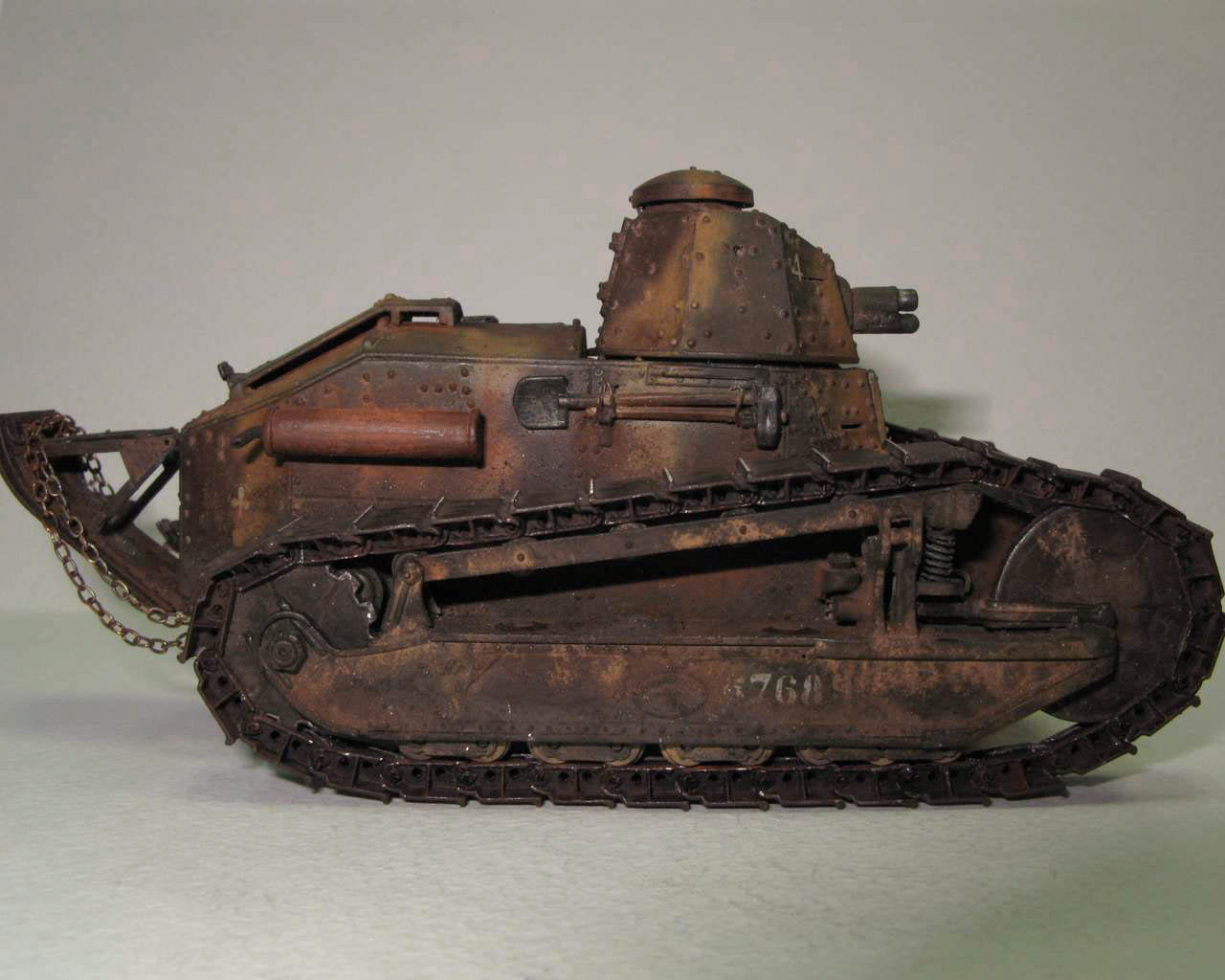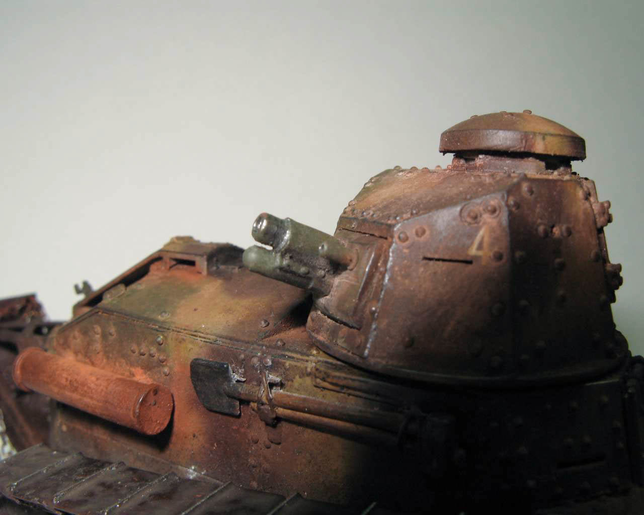 Над моделью пришлось попыхтеть. Ушло 2 пакета заклепок и один противопульных болтов от МастерКлаб. Проклепан весь танк. Использована цепь, заменены ручки и крепежи. Хвост выполнен съемным, смотровой люк водителя открывается. Ходовая часть полностью подвижная и рабочая (использованы пружины), одеты гусеницы от Фриул. Исправлены многие косяки в матчасти (подробности в сказке).