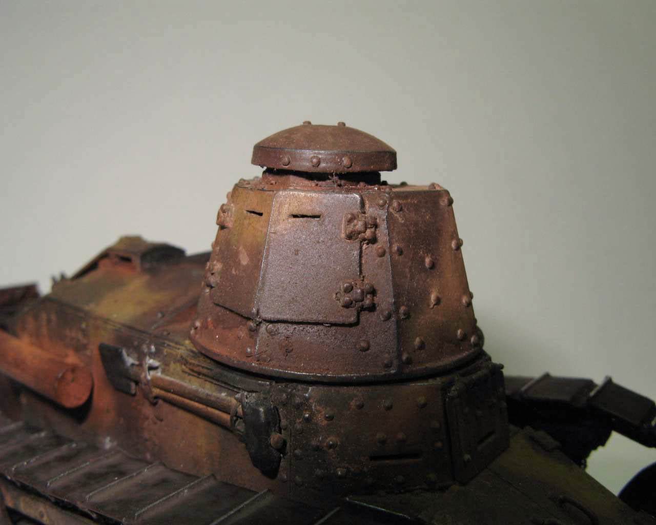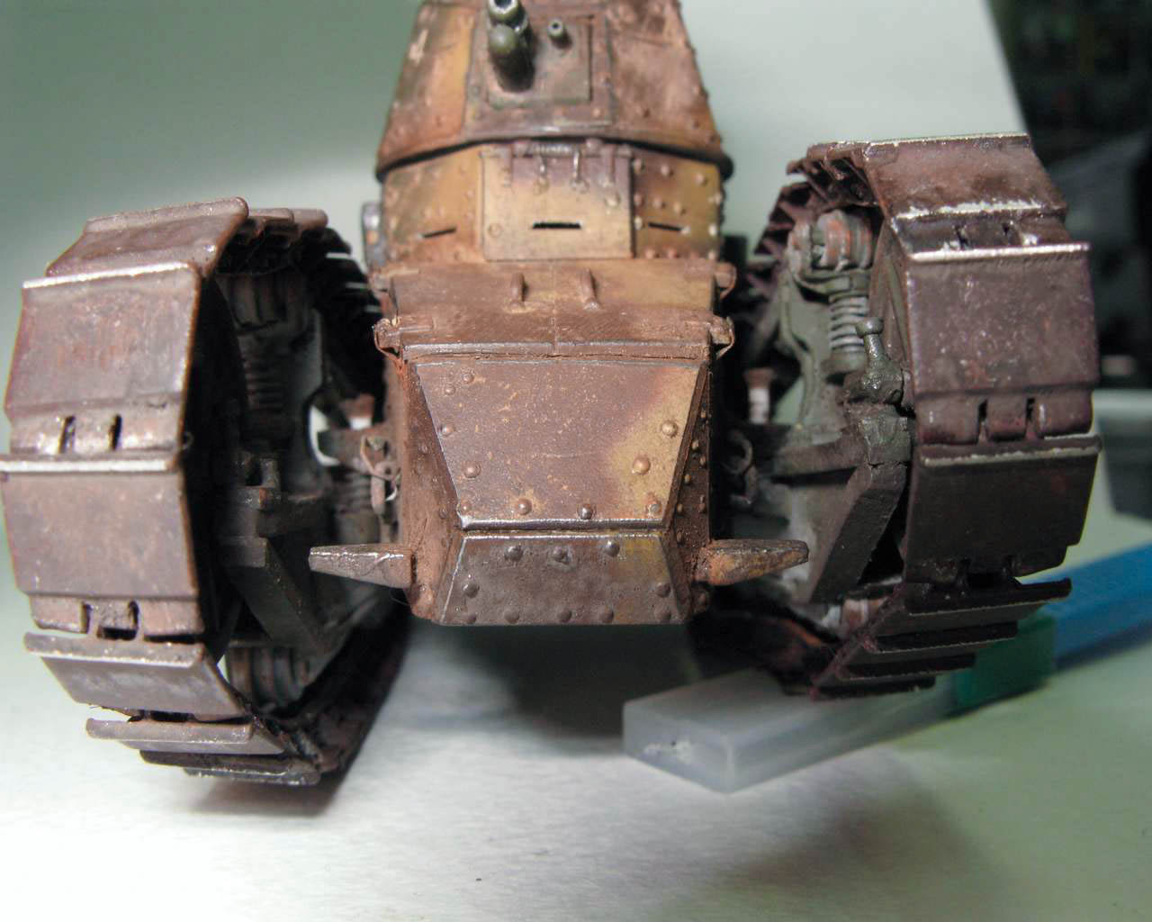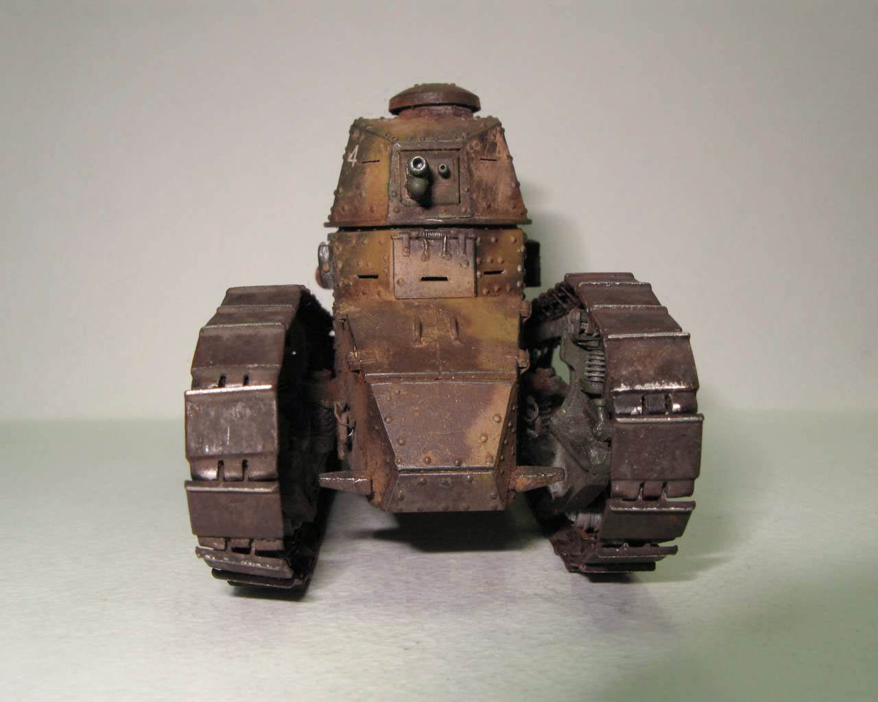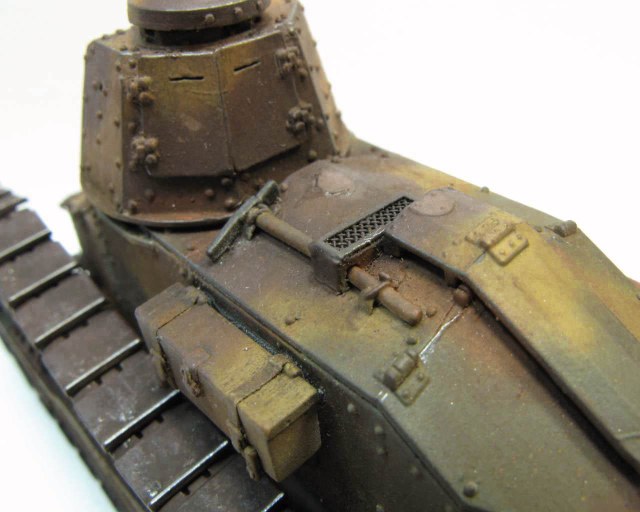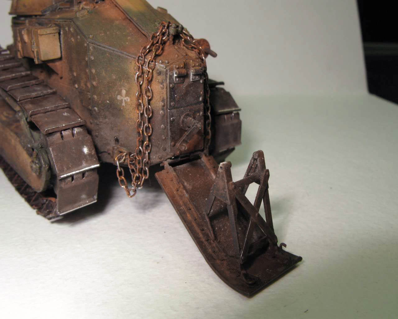 Над моделью пришлось попыхтеть. Ушло 2 пакета заклепок и один противопульных болтов от МастерКлаб. Проклепан весь танк. Использована цепь, заменены ручки и крепежи. Хвост выполнен съемным, смотровой люк водителя открывается. Ходовая часть полностью подвижная и рабочая (использованы пружины), одеты гусеницы от Фриул. Исправлены многие косяки в матчасти (подробности в сказке).