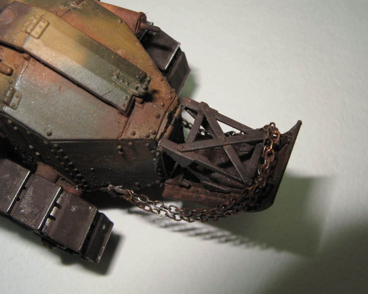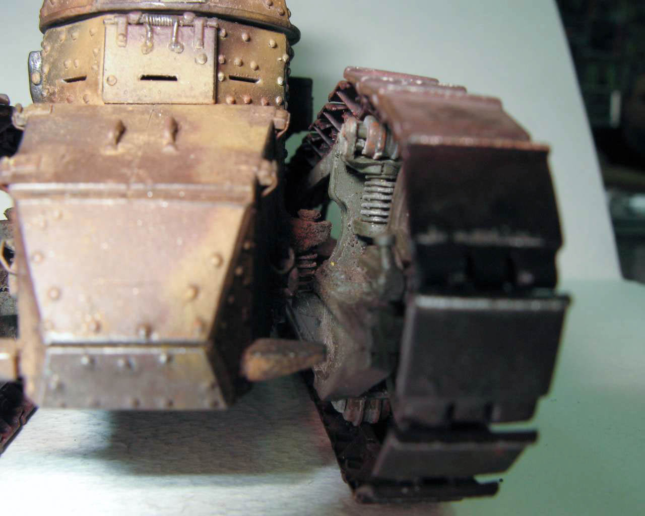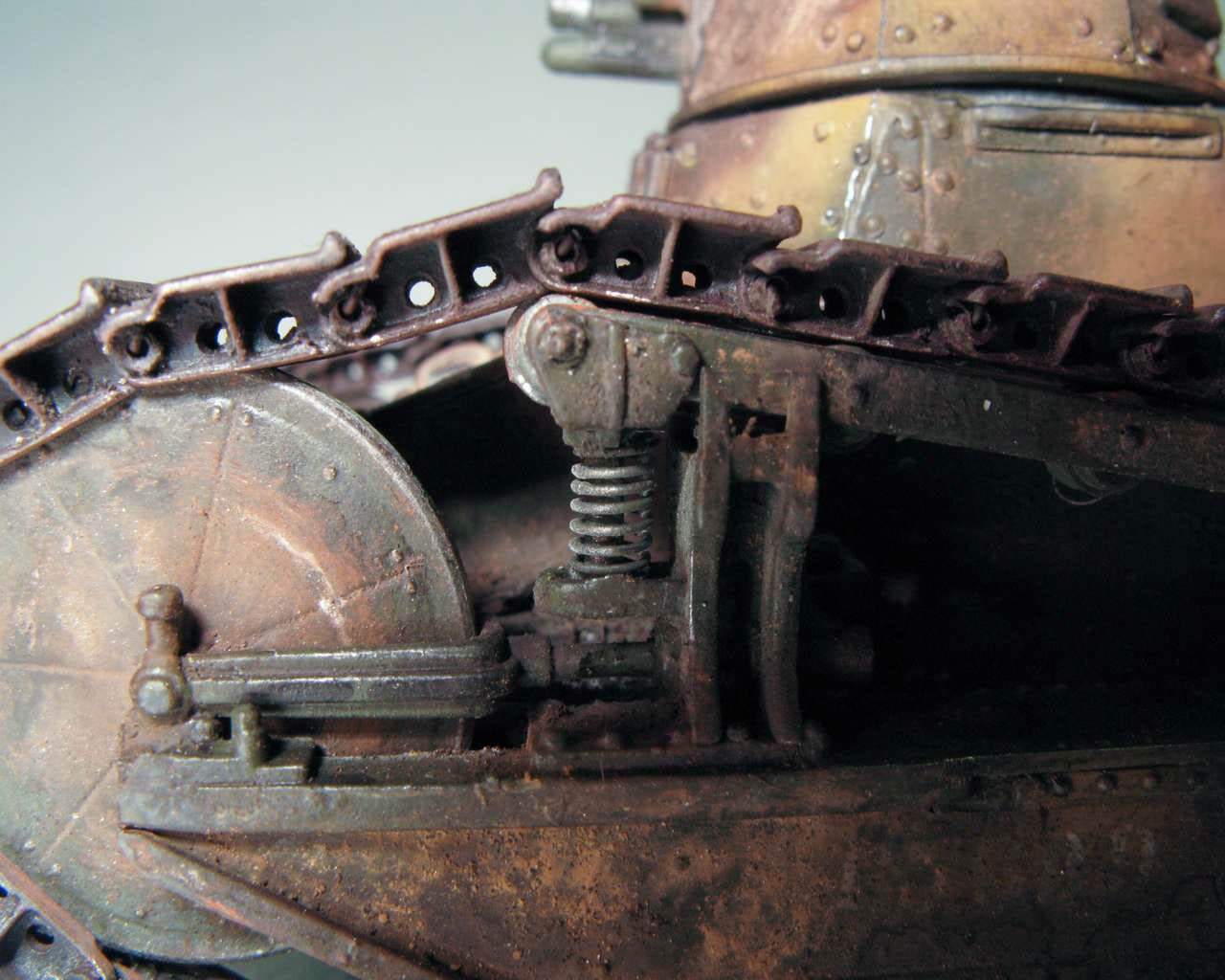 А про смешение окраски и грязи - ну так "танки не моют, а красят". Как мы в свое время в армии после проделанных маршей подкрашивали черным из краскопульта ходовку ЗИЛ-131, иногда и не очень хорошо отмытую. Краска частично вышилушивается и получается результат как у Вас(ну с учетом ржавления, конечно).