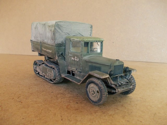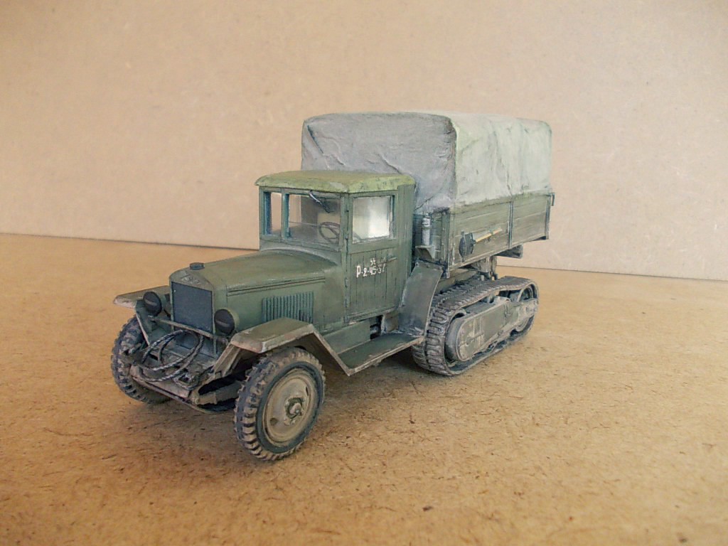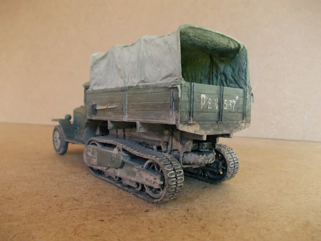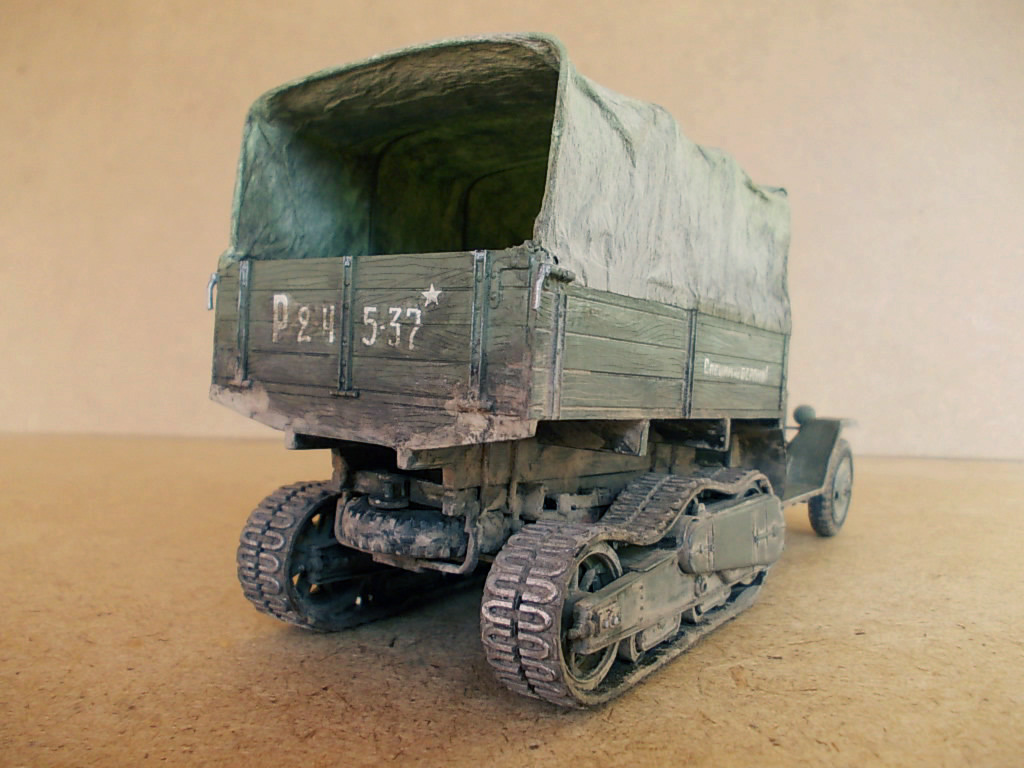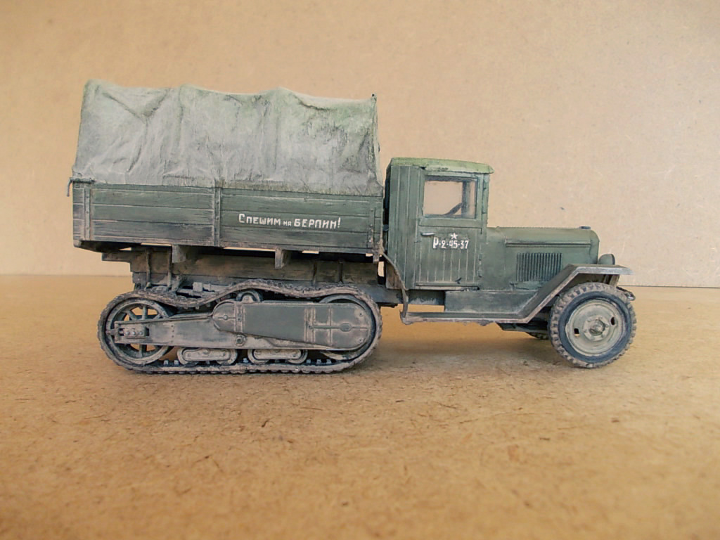 Хорошая модель получилась! Понравилось запыление ходовой, неоднородность цвета реалистично выглядит и мелочевка. Непонравился провис на гусе, "непривязанный" тент, хотя его фактура удалась. Загрязнение заднего борта несколько навязчиво выглядит и фары тонировки просят:-) Ничего что так критично? :-) А вообще смотрится модель! Удачи в дальнейшем.