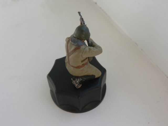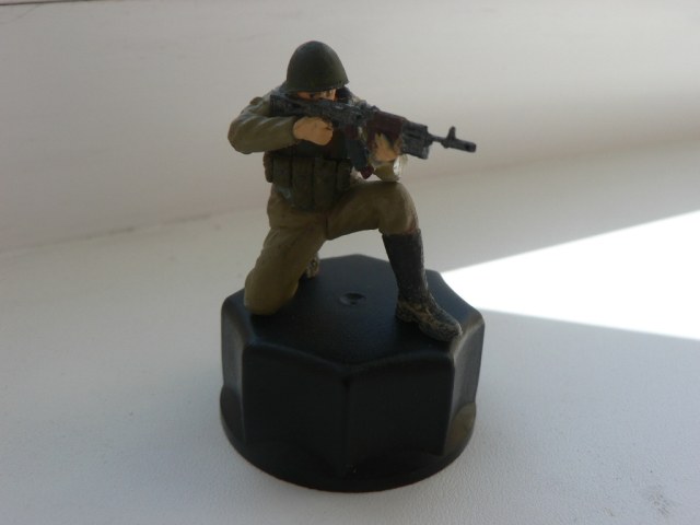 Совет - когда соберешь фигурку, прежде чем покрасить, шкуркой сточи все места соединений (рука-туловище) до ровной поверхности, и там, где увидишь щель (как между ног у твоего бойца) постарайся зашпатлевать.