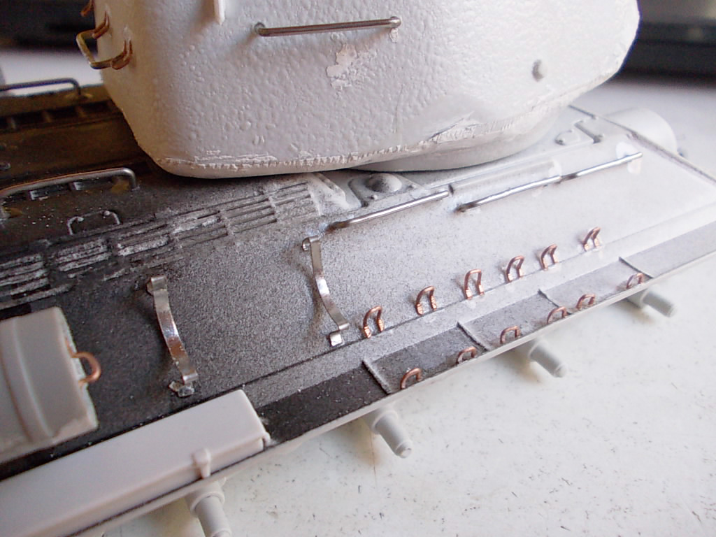 Перепилил башню-переставил вентиляцию,изменил низ и бока башни ,добавил сварные швы ,прилепил номер с литника.Поручни и петельки естесвенно из проволоки .
