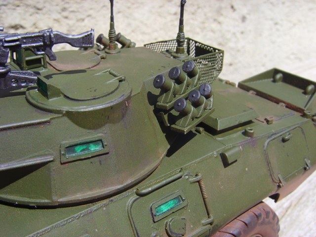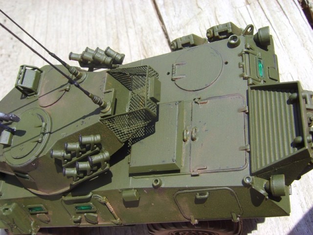 Из незначительных доработок могу только выделить антенны из тянутых литникови тонировку стекол, которую сразу признаюсь сделал очень криво. Во-первых замазал стекла клеем в процессе и во-вторых саму тонировку наносил обычным перманентным маркером зеленого цвета. Покраска модели осуществлялась по ходу ее сборки. Здесь я испытал несколько новых техник для себя. Модель обезжирил водкой, чего раньше никогда не делал, а затем наносил эмаль от Tamiya цвет Olive Drab кистью. Разводил ее родным растворителем x-20. Наносить пришлось около 5 слоев и все равно конечным результатом я был не очень доволен. Краска легла не очень равномерно, на свету местами были видны разводы. С подпорченным настроением я продолжил работу. Нанес смывку акрилом от звезды, после чего приступил к "росписи". Простой гуашью и тоненькой кистью нарисовал сколы, потеки и немного грязных брызг. Затем задул модель матовым лаком ts-80 от все той же Tamiya и тут наверное мне было суждено получить награду за терпение и старание. Все нюансы, о которых я говорил по поводу покраски эмалью в пять слоев кистью пропали. Модель стала выглядеть заметно лучше! Завершающим штрихом было запыление отдельных частей тертой пастелью. Что получилось судить вам!