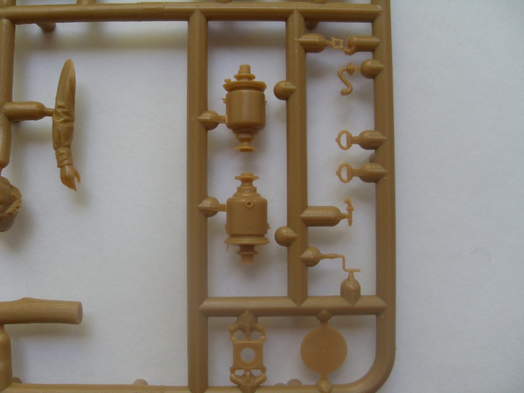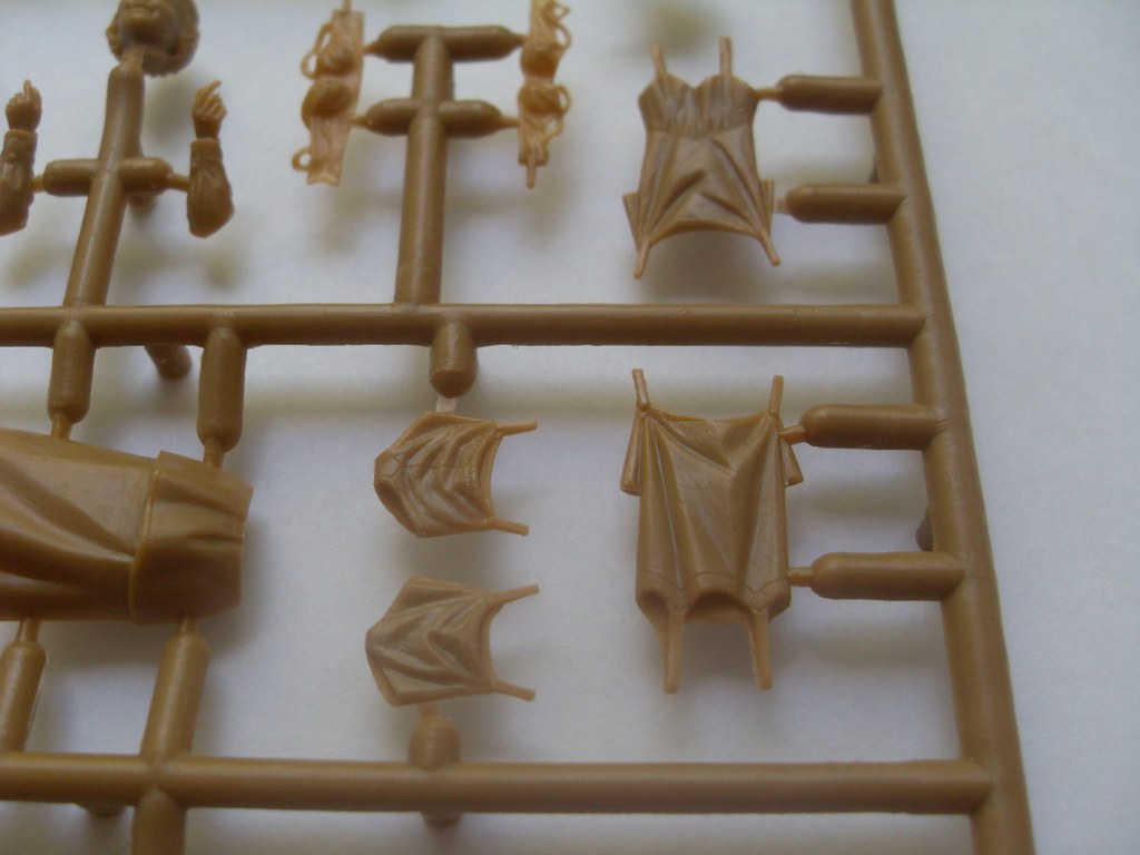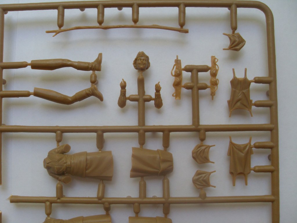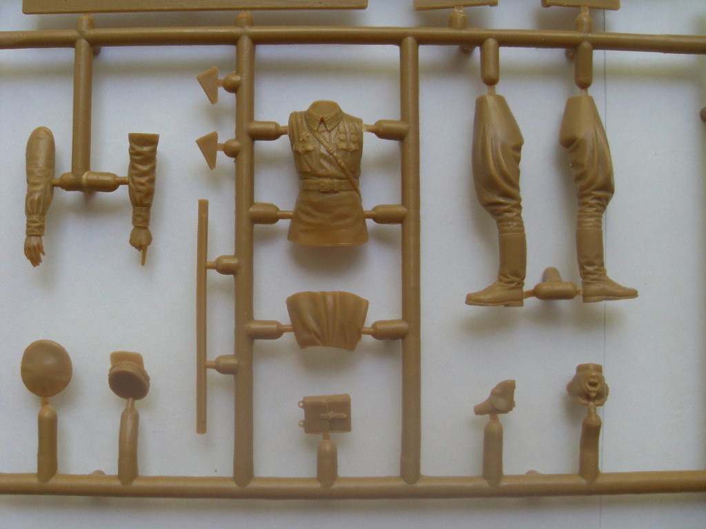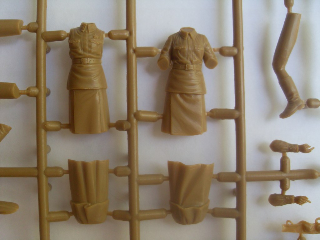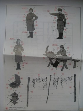 Итак, в небольшой коробке с верхней загрузкой находится один литник, запаяный в пакет и вдвое сложенная инструкция формата А4. Качество пластика традиционное для последних моделей этой фирмы. Каких либо огрехов литья не обнаружено. На некоторых деталях присутствует облой, ну совсем уж незначительный. Проработка фигур мне показалась на вполне высоком уровне, лица достаточно живые. Из набора, помимо четырёх фигур можно собрать стол со скамьёй на котором одна из женщин будет занята заполнением документов (на фото видно, что заодно с, предположим, книгой учёта, отлиты три письма-треуголки) самовар, патефон и ... элементы женского нижнего белья, развешанного для сушки, чем видимо и недоволен старшина). Бельё само по себе неплохо отлито, но конечно местами большей, чем нужно толщины, хотя наверно для пластика это неплохо. Нитку же, на котором оно будет висеть, производитель предлагает сделать самому.