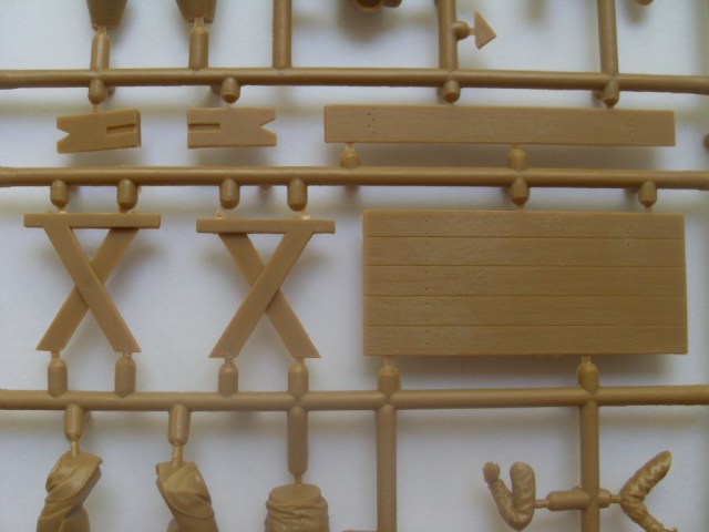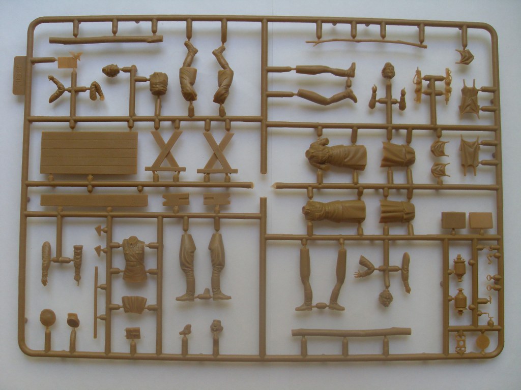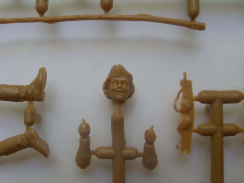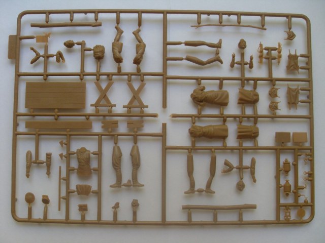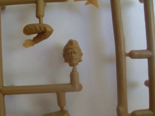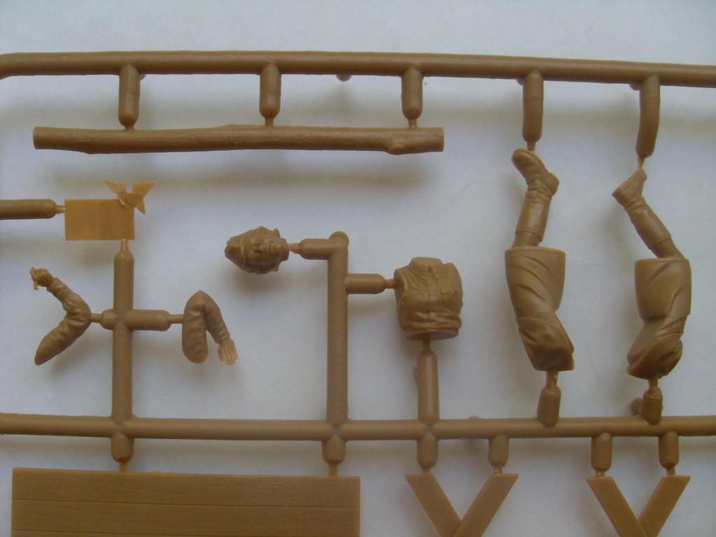 Итак, в небольшой коробке с верхней загрузкой находится один литник, запаяный в пакет и вдвое сложенная инструкция формата А4. Качество пластика традиционное для последних моделей этой фирмы. Каких либо огрехов литья не обнаружено. На некоторых деталях присутствует облой, ну совсем уж незначительный. Проработка фигур мне показалась на вполне высоком уровне, лица достаточно живые. Из набора, помимо четырёх фигур можно собрать стол со скамьёй на котором одна из женщин будет занята заполнением документов (на фото видно, что заодно с, предположим, книгой учёта, отлиты три письма-треуголки) самовар, патефон и ... элементы женского нижнего белья, развешанного для сушки, чем видимо и недоволен старшина). Бельё само по себе неплохо отлито, но конечно местами большей, чем нужно толщины, хотя наверно для пластика это неплохо. Нитку же, на котором оно будет висеть, производитель предлагает сделать самому.