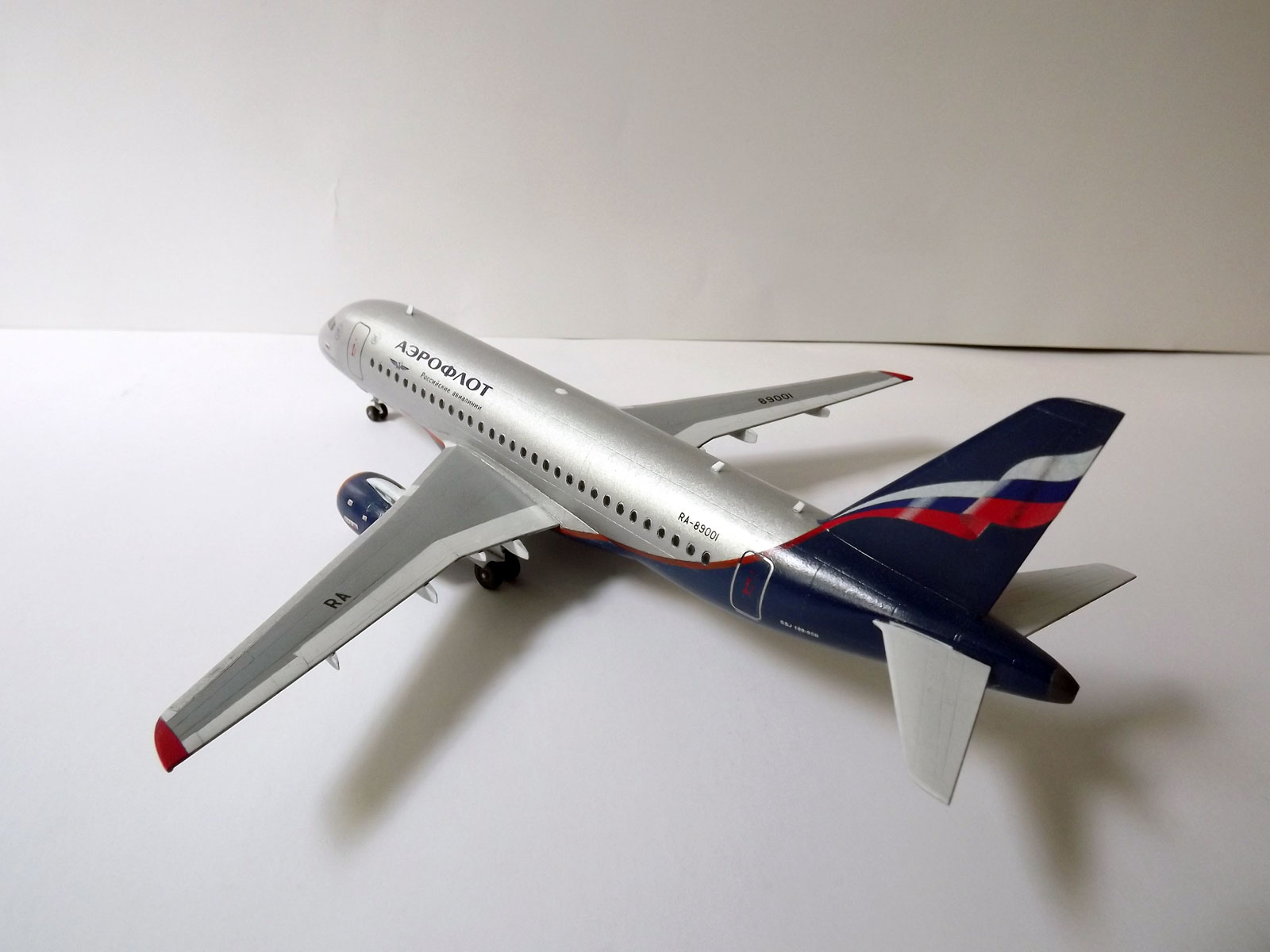 Сухой Суперджет 100 производства «Звезды». Модель одно время исчезла с прилавков, затем была перевыпущена в новой коробке. Набор достойного качества, ничем не хуже ревелловских аэробусов - без утяжин, почти без облоя. Стыкуемость в норме. Крой внутренний, очень тонкий. Остекление дается только стеклами. Прилагается подставка, для чего в днище самолета можно вырезать щель. Декаль тоже высокого качества, но она бедна техничкой и предлагает всего один вариант, Аэрофлот RA-89001. А как же АрмАвиа? И еще недостаток – вообще не проработаны ниши шасси.