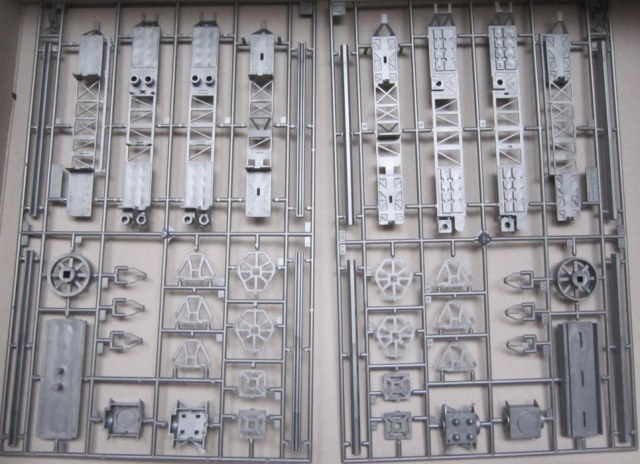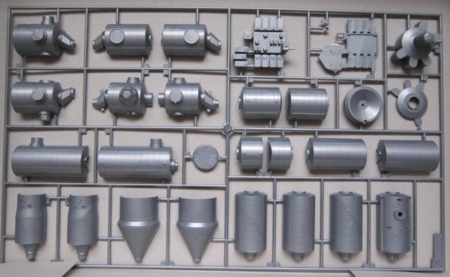 Что касается модели- она представлена стандартной ревелловской упаковкой в синих тонах. Литники, довольно- таки четкие, следы толкателей и утяжины я нашел лишь в неск. местах. По цветам литники даны стальным, синим и белым цветом и предлагаейтся их так оставить, типа, не стоит красить- "близко" к оригиналу Но эта порнография- не наш путь!)))) Каркас все конструкции дан металлическими стержнями, который крепится над стилизованным макетом Земли.