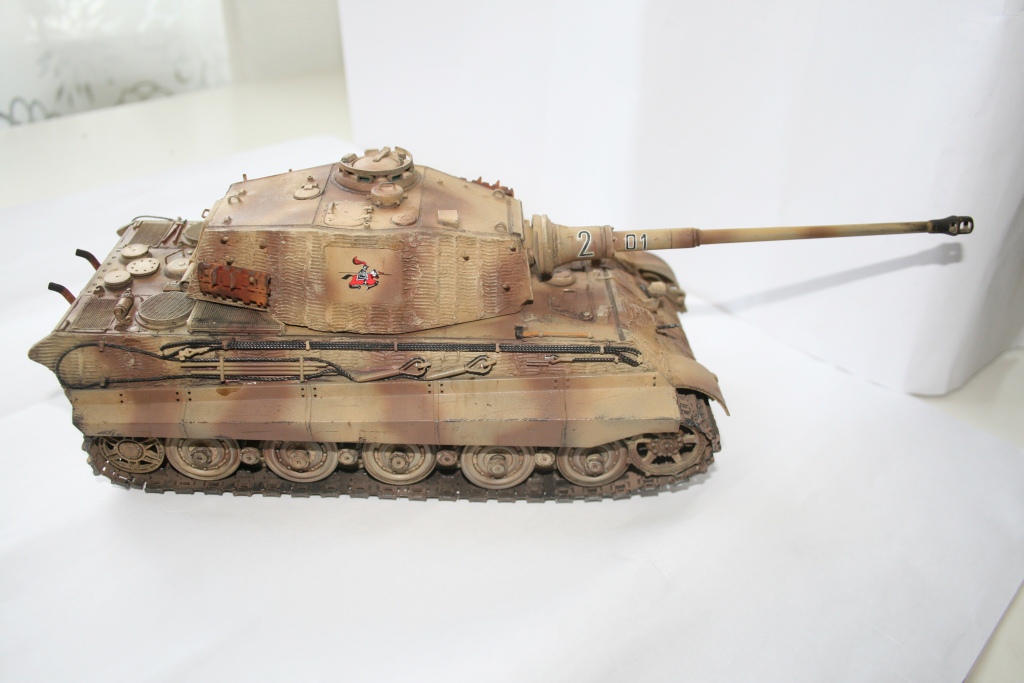 При первом взгляде отлично.Если разглядывать-обращают на себя внимание участки,на которых нет циммерита,а он там должен быть(фронтальная часть башни,тыльная часть корпуса),траки кривоватые,трос неестественно тонкий и блестящая декаль.Хорошо,но можно было чуть лучше.