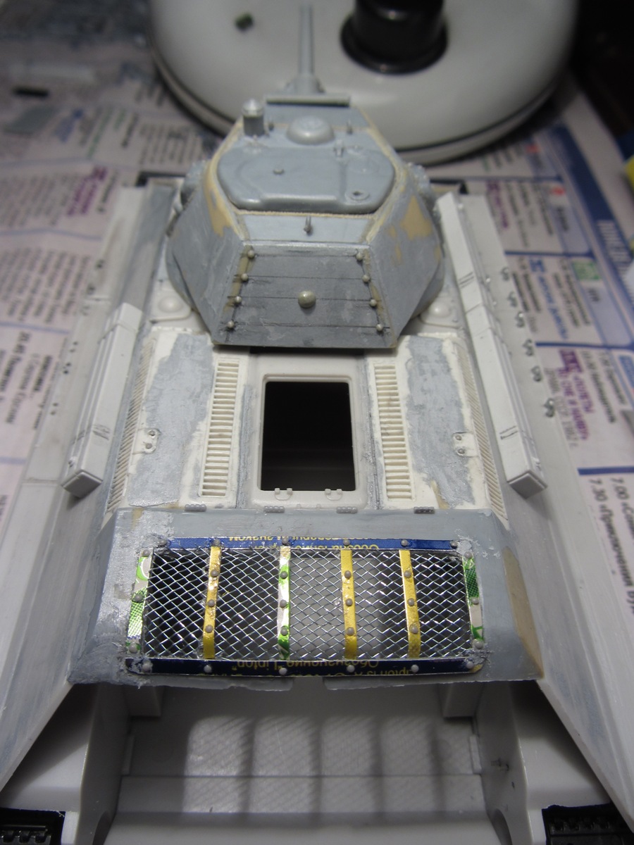 - нарастил тамиевским эпоксилином детали с боковыми решётками МТО, а также им заделал щели между задними верхней и нижней бронеплитами.