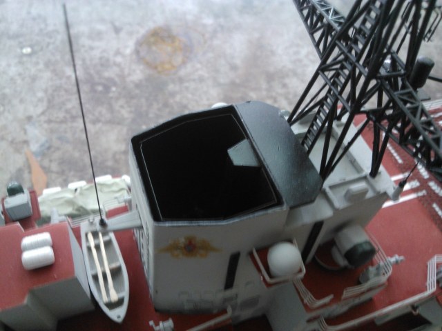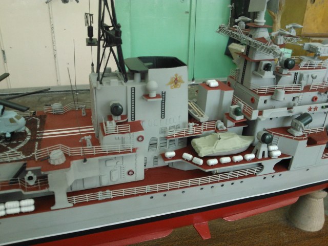Теперь верх: палуба должна быть черно-металлическая. Цепь якорная не должна лежать как попало.Комингсы отбиты красно-коричневым,как и все верхние палубы.Катера в 1/200 можно и открыть,а то чехлы наброшены как попало,даже не затянуты.С пушками нужно поработать и сильно.Ну хотя бы трубки охлаждения показать.И добавками и красками.На дымовой трубе очень характерная деталь-система "Струна".Выполнить не трудно,а реальности прибавит.Вертолет из разряда страшного сна.Бревна вместо лопастей да еще черные.Вертолет белый с голубым,лопасти кремовые и ,даже если нет травленки/а у вас там Китай под боком,заказать на раз и не дорого/ можно самому вырезать из тонкого металла/медь 0,2/ и с фотографией в руках автомат перекоса и прочее сделать.В 1/350 люди делают.