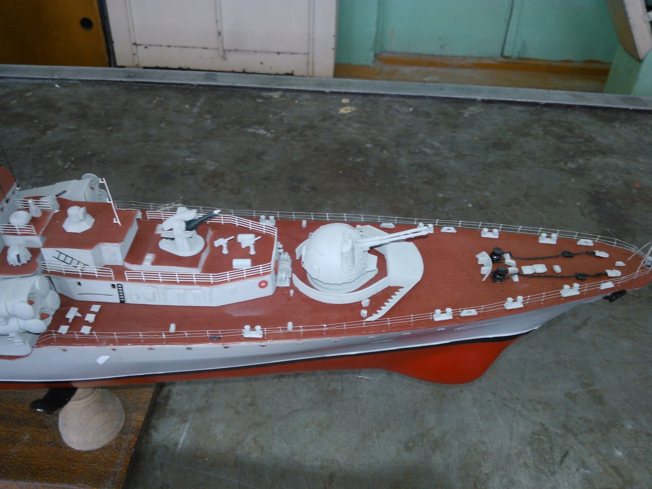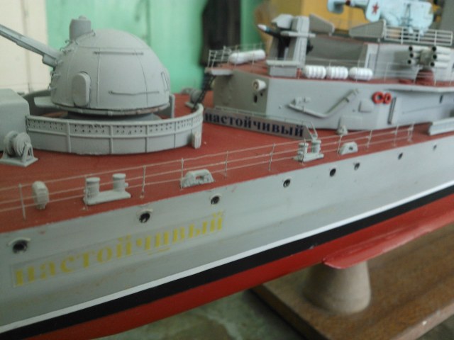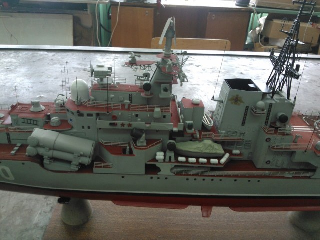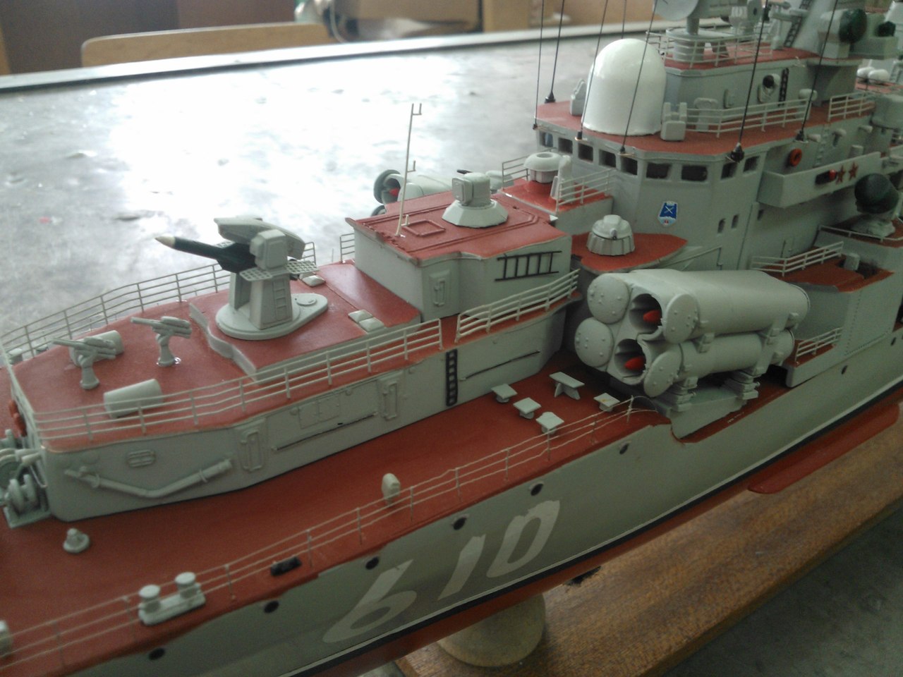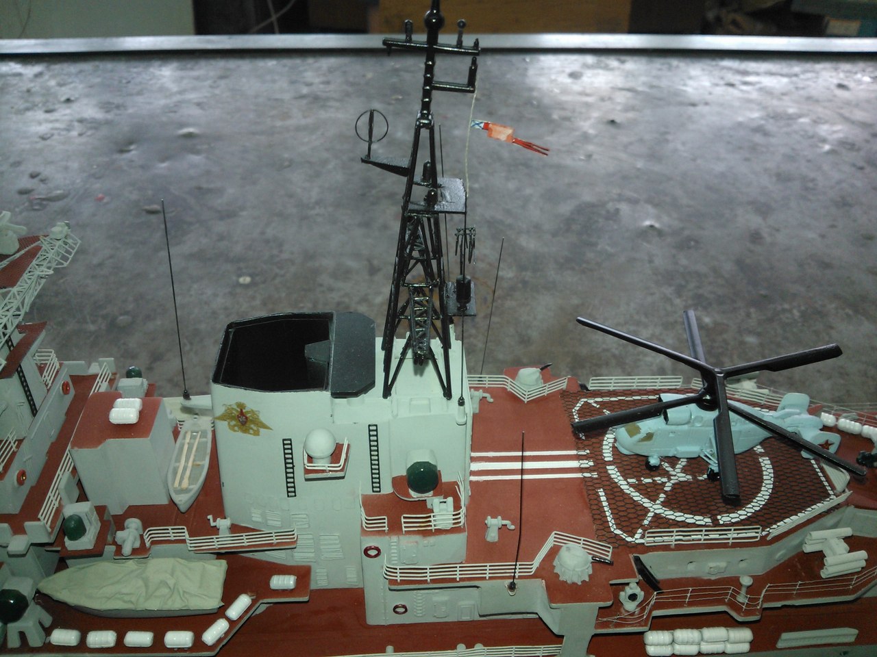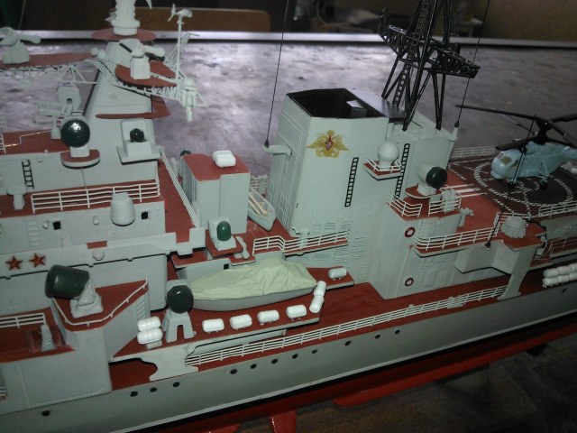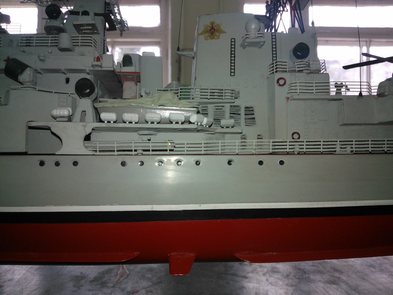Покрашен тамиевской краской аэрографом,Доработаны многие узлы:мачта,труба,вентиляция на трубе,Ак-130,радиолокационные системы,ну и так по мелочи.Приятного просмотра))