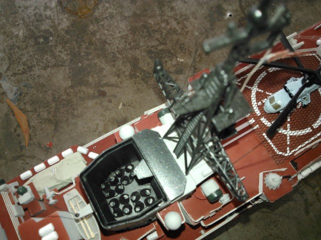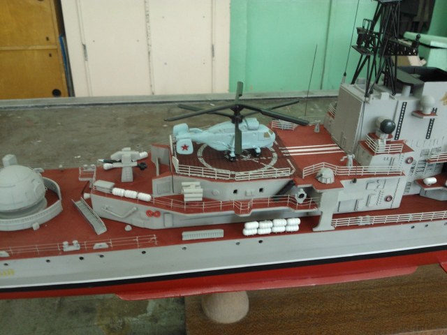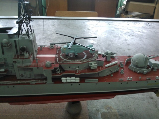 корпус я сам не стал переделывать.по поводу палубы когда эсминец спустили на воду у него палуба красно коричневая у меня даже в журнале вырезка где-то была.А вертолет я собираюсь полностью переделать у меня и чертежи подробные есть.с фотографиями что-нибудь постараюсь решить.