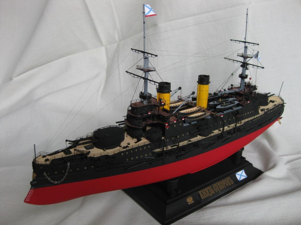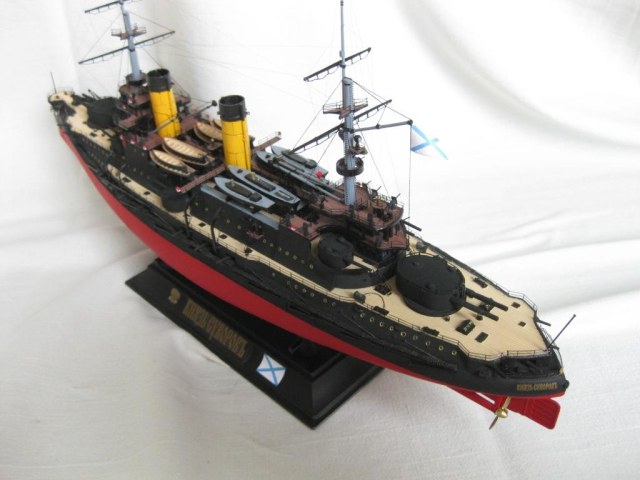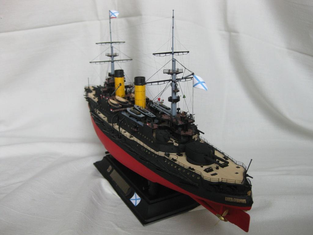 Доброго времени суток Уважаемые! Представляю Вам первый отечественный)) броненосец ,собранный с применением суперсовременных,космических технологий 21 века)) А именно - аэрограф,фототравление,шпаклевка,остекление и т.д.)) Набор был приобретен мной в начале февраля и сборка была задумана как некая "разминка" ,перед не дающем мне покоя "Тирпицем")).По мере строительства было принято решение все же "выложиться по полной" и попытаться изготовить нормальную модель. К сожалению не удалось приобрести "именное" травление,поэтому многие детали изготовил по старинке самопально)).Травление использовал ABER ,NORTH STAR . Краски -Звезда.Такелаж - нить и бантик. Про работу с набором,стыкуемость и все такое, скажу так - и все-таки он.....хороший)). Из явных неуспехов моего "Суворова" выделю "неродные" мостики носовой надстройки,когда увидел несоответствие -было поздно,разбирать поленился)). На корме произвел "перепил",но опять, на верхнем мостике компас должен быть ближе к мачте а трап к корме,обнаружил это тоже уже после...)) И да "простит " меня Зиновий Петрович ,не "обшил деревом" леера ,пытался но получилось очень скверно,отставил затею)). А в целом ,получил от процесса громаднейшее удовольствие,даже грустно ,что почти полугодовая стройка закончилась ( ! Вот наверное все вкратце. Отсеки и перебоки задраил ,готов к торпедам!)))))) С Уважением!