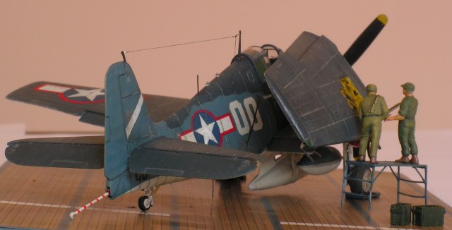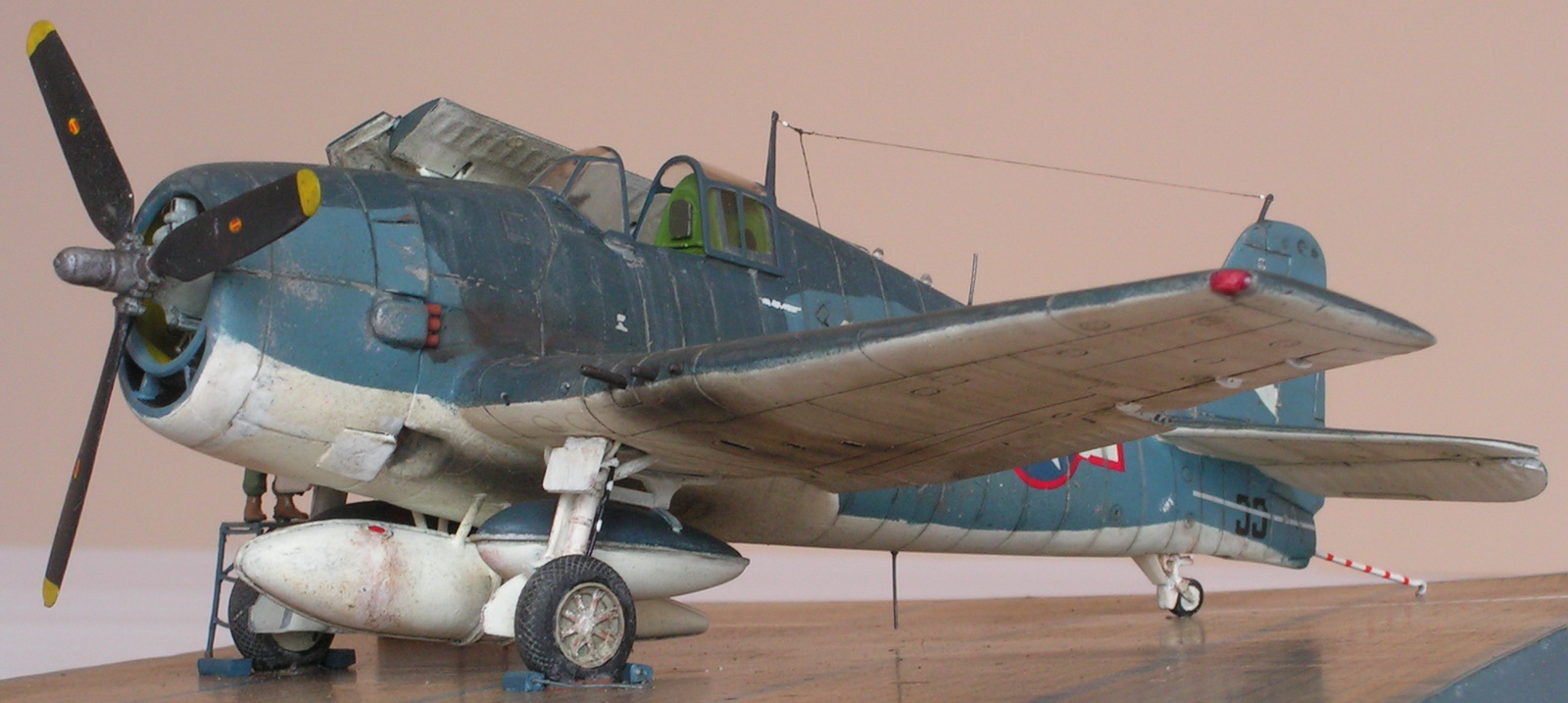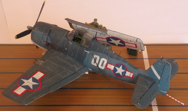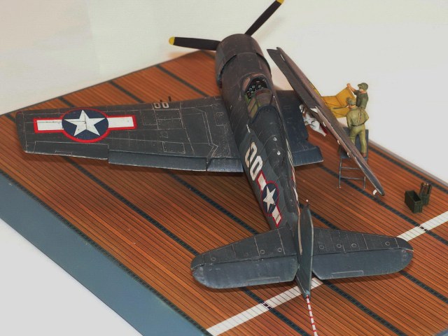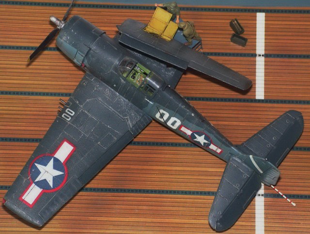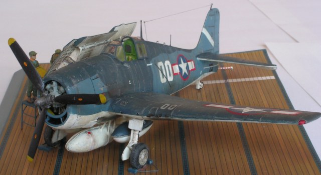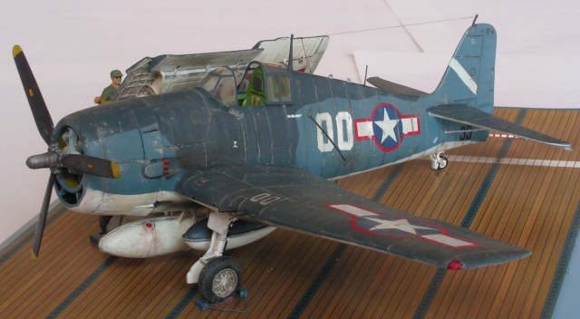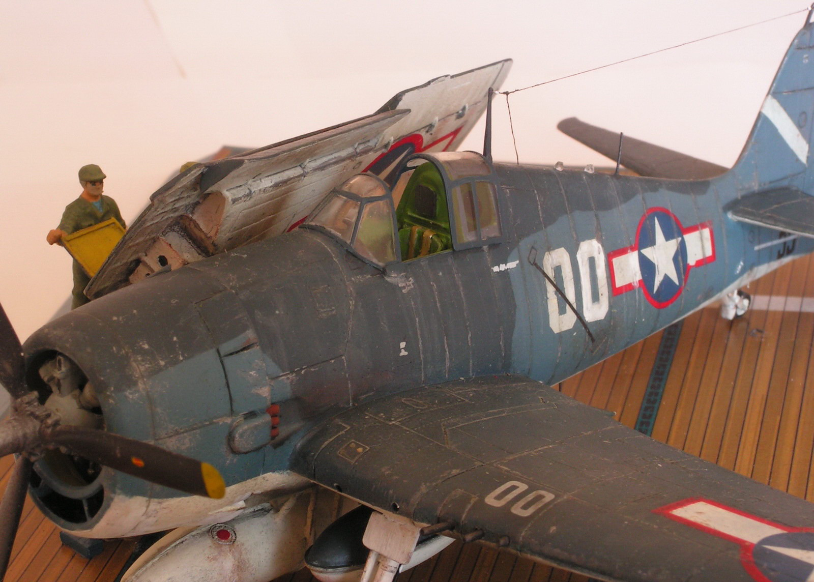 Так это вам скорее в раздел "диорамы"! Работа понравилась, но есть вопрос по матчасти. Насколько знаю, механики на авианосцах даже в войну тщательно следили за состоянием самолетов. Что, кстати видно и на приложенной Вами фотке. А у Вас самолет какой-то уж больно грязный и ободранный.