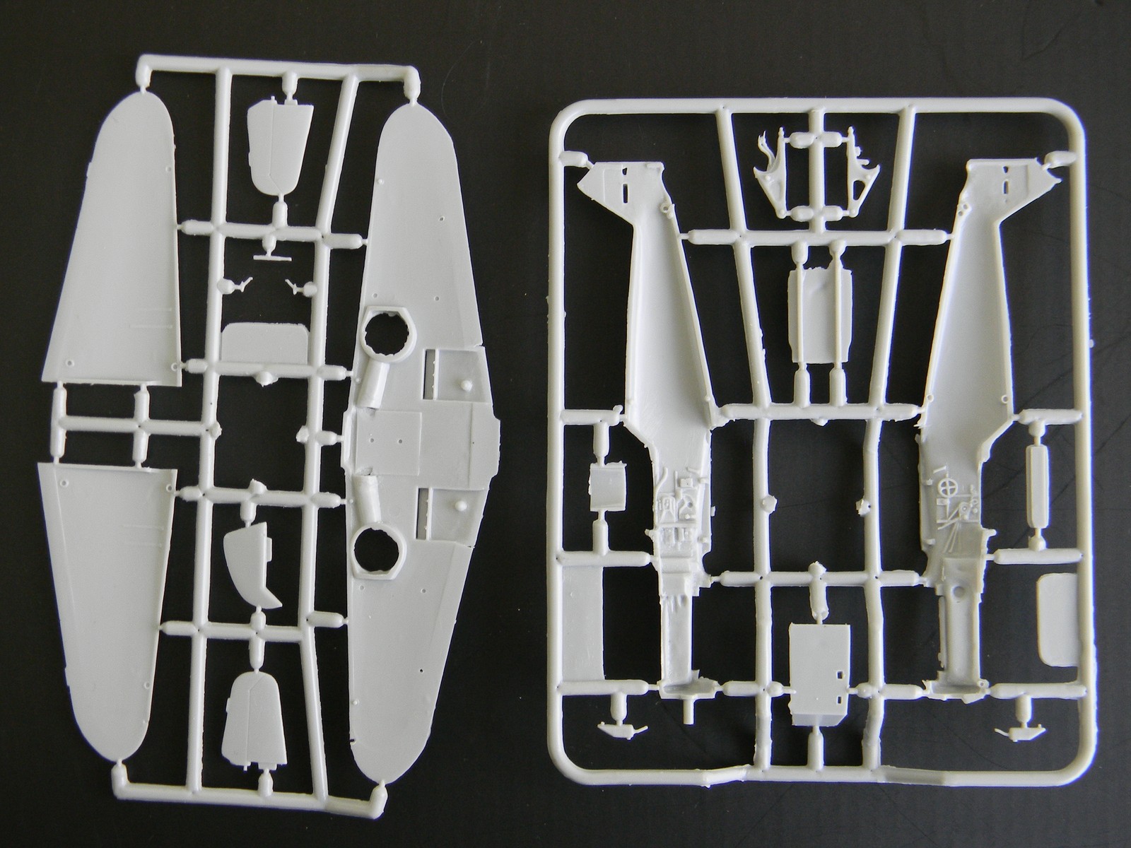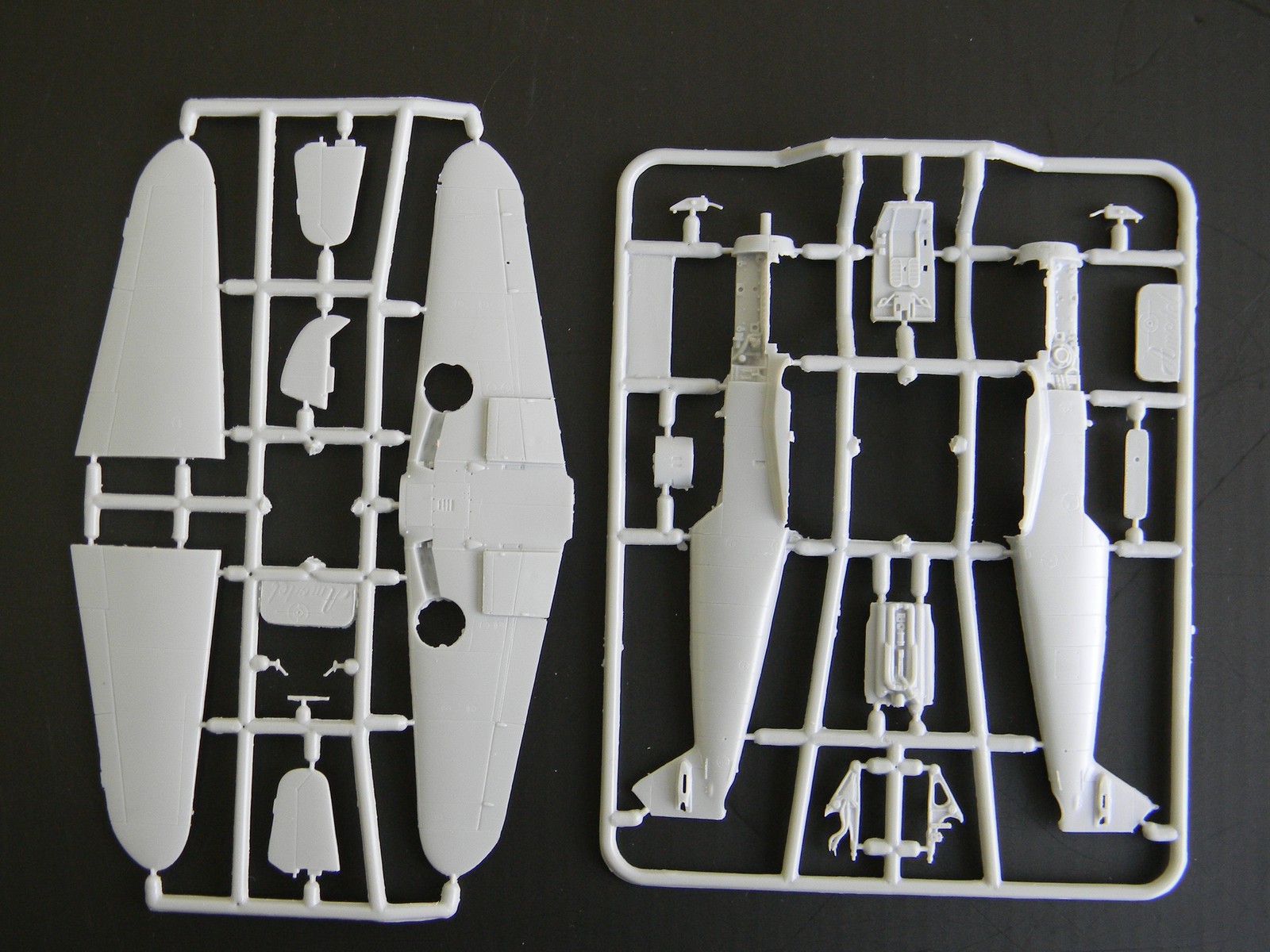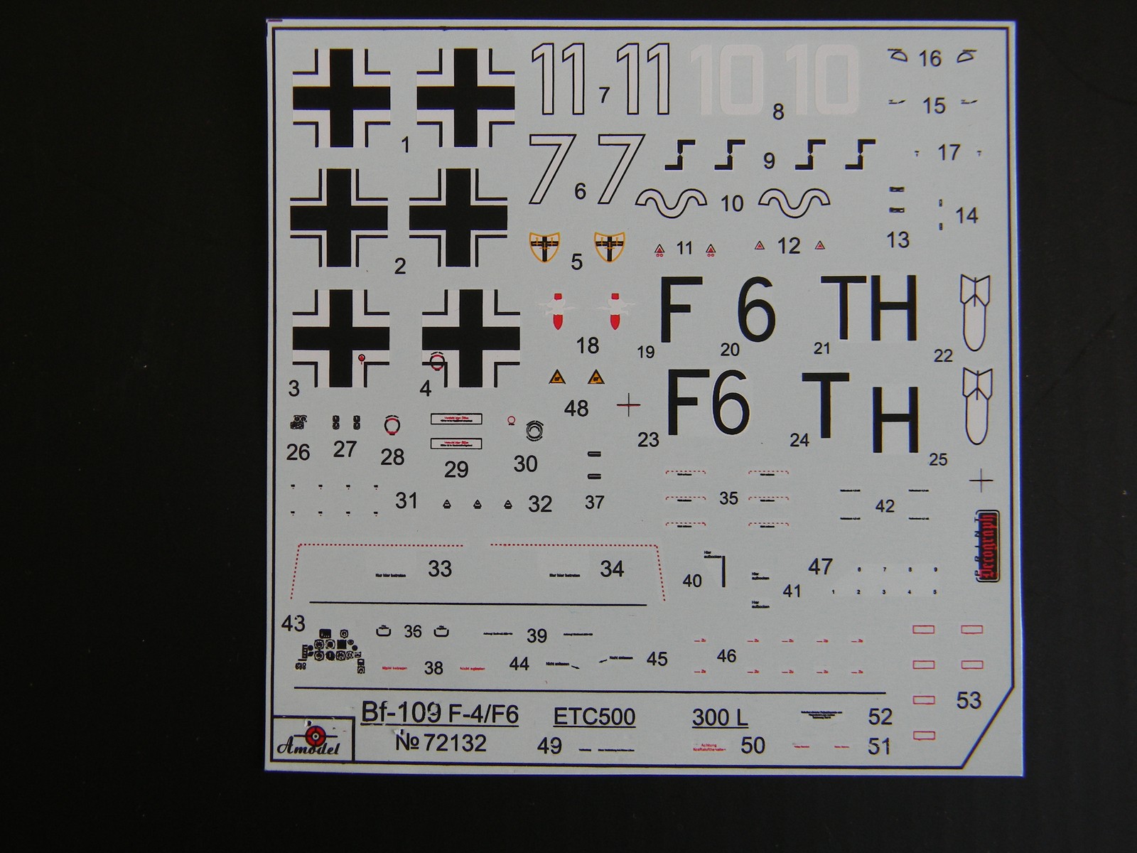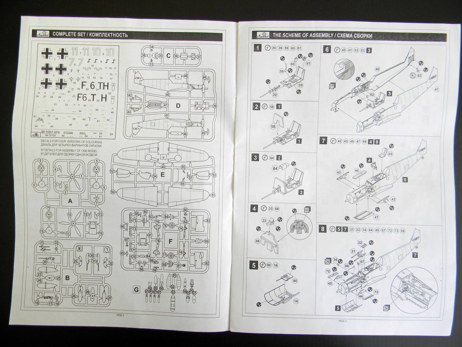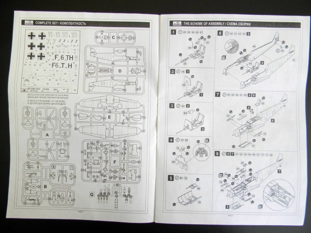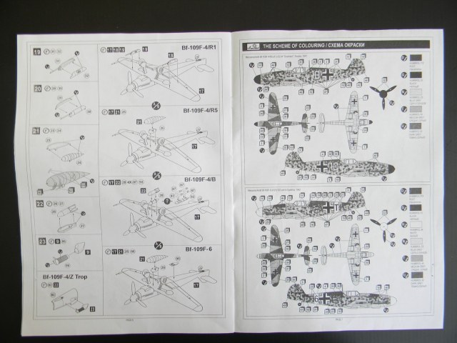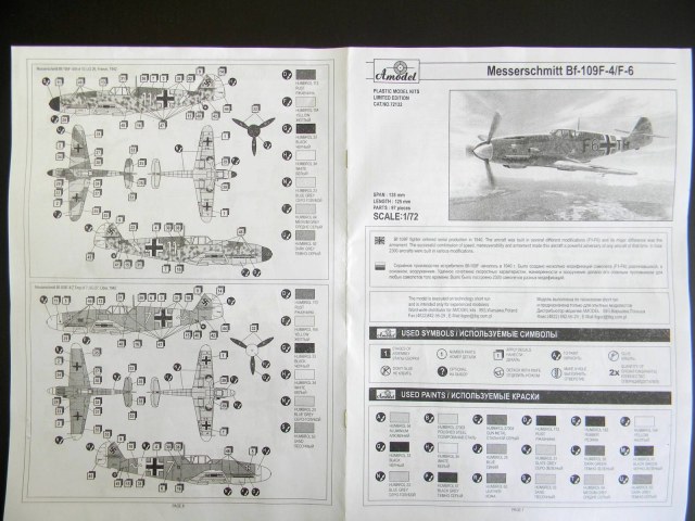 Добрый день, каропчане. Представляю обзор модели Messerschmitt Bf-109F-4/F-6 производства Amodel. Несмотря на то, что выпущена давно, обзора на сайте я не нашел. Итак: в достаточно большой по размерам коробке, в полиэтиленовом пакете лежат 6 (шесть) литников серого пластика (облой есть практически на всех деталях, но очень небольшой расшивка тонкая, местами чуть "замыленная"), один - прозрачного , т.е. фонарь; декаль на 4 варианта окраски с техничкой и инструкция по сборке, подробная и понятная.