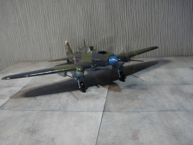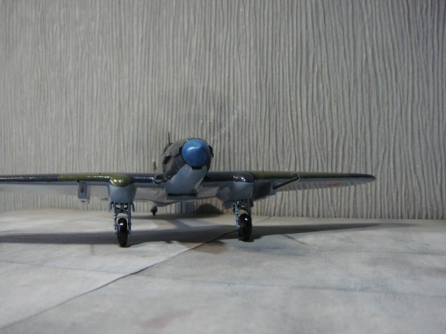 Теперь о наборе от Звезды, который многие уже знают с негативной стороны. Это – перепак древней и не очень совершенной модели от какой-то фирмы, вроде как «Токо», чем-то по качеству напоминает Alangerи Восточный Экспресс. Отсутствуют внутренние створки маслорадиатора, сам маслорадиатор неправильной формы, изгиб пропеллера никакой. Звезда не упомянула, что делать с отверстиями и утолщениями в крыльях под 23-мм пушки, если используются пушки НС-37. А там, судя по фото военных лет, должно быть гладкое место. Срезал лишнюю пластмассу на месте установки 23-мм пушек, зашпаклевал отверстия. Вообще, в процессе сборки широко применялась шпатлевка и наждачная бумага. Добавил балансир на верхнюю часть киля, удлинил пулемет стрелка, добавил декаль на приборную доску, посадил пилота. Красил автонитрокрасками Vikaкистью. Старался красить очень аккуратно. На покраску только ушло 4 дня, старался точно воспроизвести геометрию камуфляжа на оригинале, в том числе и музейный блеск.