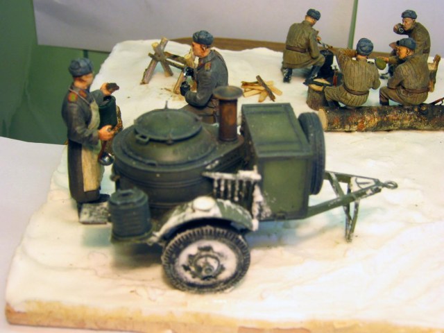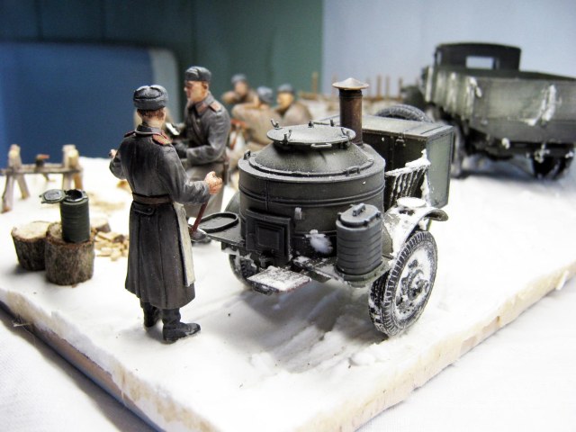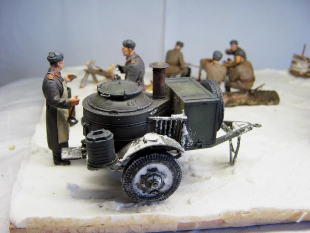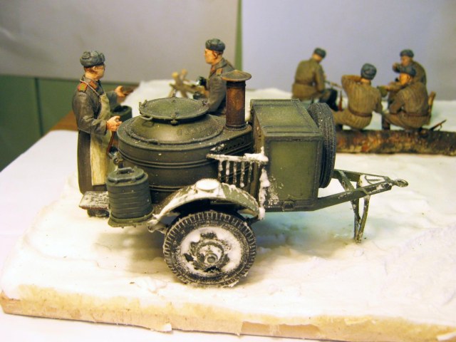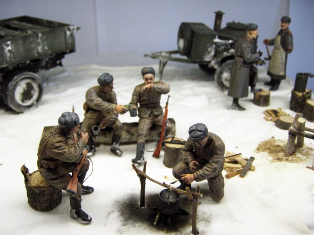 Хорошо получилось, душевно. Композиция расположена логично. Немного смутила послевоенная кухня (но это кто знает и вживую видел))))), да немецкие карабины у бойцов (судя по погонам и шинели, это уже минимум зима 43-44 г., своего оружия было достаточно, трофеи заставляли сдавать...)