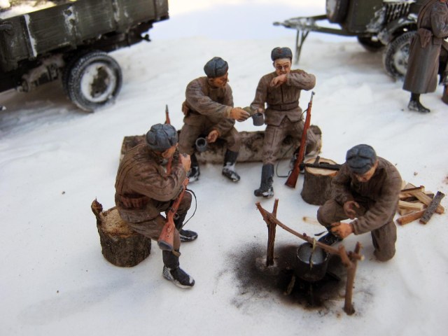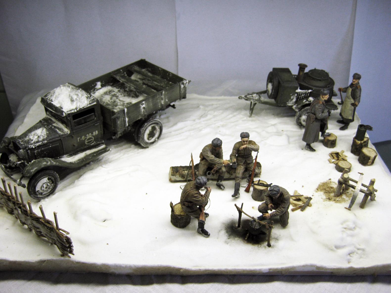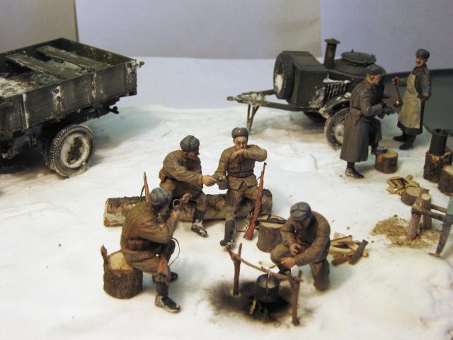 атмосферная работа! парочка придиризмов))) колеса полуторки висят в воздухе. бойцы, видно, не дождались обеда с кухни и готовят закусь сами. ну и зря они при офицере спирт хлещут так в наглую)))