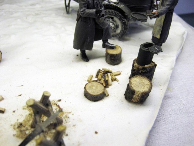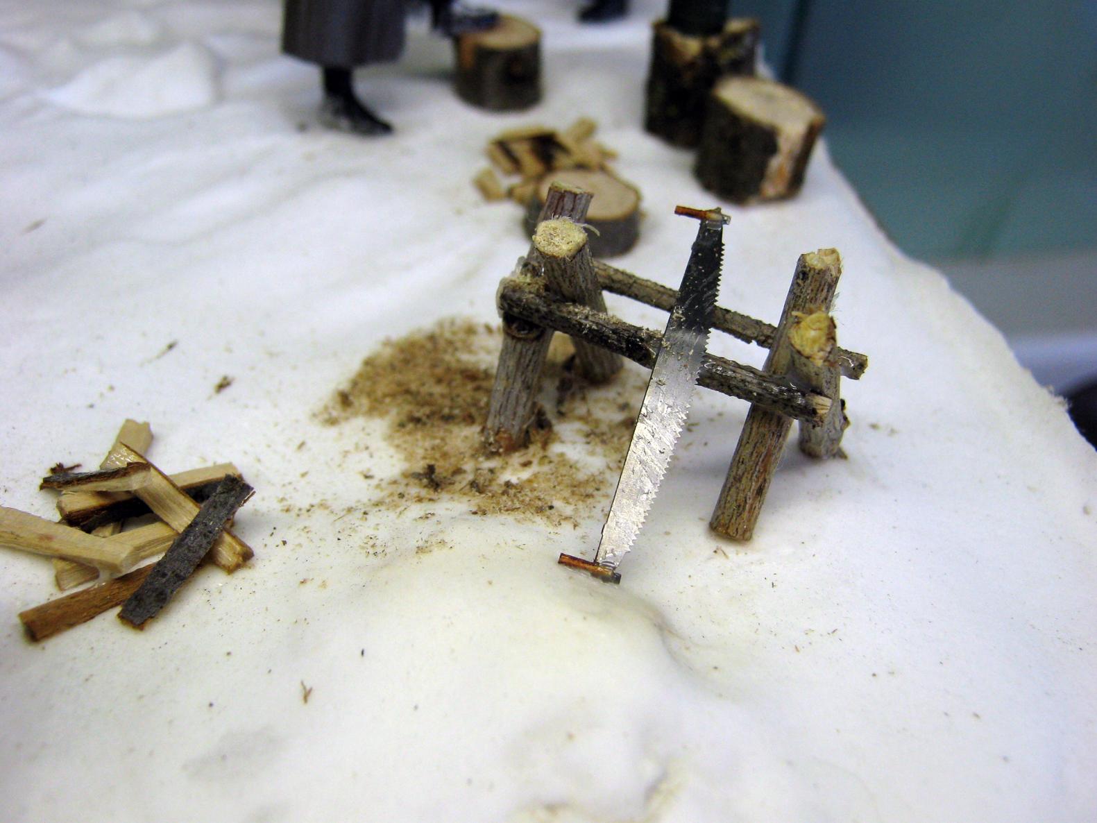 Работа,несомненно,хороша.Видно старание,мастерство.Снежок вышел на все 100,доработки из "природного материала" тоже хороши:пила с бревном,котелок,дровишки.