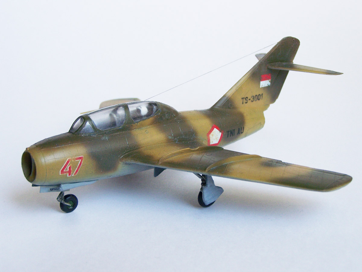 Модель собиралась тяжело, стыкуемость не на высоте, имеются довольно большие вмятины, по этой причине не стал делать серебристым, т.к. зашпаклёвывать клёпку очень жалко, но всетаки её ушло не мало. Модель исторической привязки не имеет, камуфляж нашел в инете , опознавательные знаки индонезийские от бегемотовской декали к Су-27. Краски, лаки - тамия , тонировка - гуашь. Кресло и приборка обучаемого пилота смоляные, пилот - из запасов.