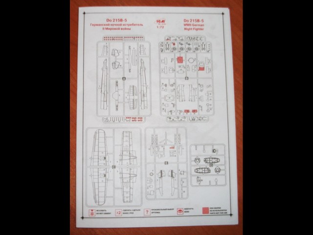 Традиционая коробка с верхней загрузкой, в которой лежат 5 литников темно-серого пластика, один литник с прозрачными деталями, довольно внятная инструкция с этапами сборки,