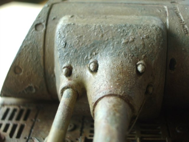 Также Вы совсем позабыли про тонировку трущихся поверхностей на модели. Лично у меня сложилось впечатление, что танк долгое время стоял на месте и не двигался -беговых дорожек на гусеницах нет, бандажи катков не тонированы, зубья гусениц и ведущего колеса также и т.п.
