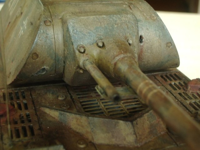 мне интересно, почему 75% моделистов уверены, что маус будет смотреться более выигрышно, если его "убить" по самое "не хочу". Задумка по предаче фактуры броне интересна, но не удалась- помножте Ваши неровности на масштаб и получите волны и дыры в броне. Катаная броня здесь никак не "читается" -лично мне сперва показалось, что танк целиком отлит. Фактура литья на маске, как уже отмечали, походит на много раз перекрашенную деталь, но никак не литую. Следы от непробитий, на мой взгляд, также не удались. Кровавые подтеки смотрятся ужасающе, во всех смыслах. Выхлопные трубы изнутри следовало подкрасить черным- а то они ржавчиной внутри так и светятся. Потеки вышли очень хорошо, но их слишком много, да и вообще за всем везерингом камуфляж не разобрать- и из-за этого модель смотрится однотонной.