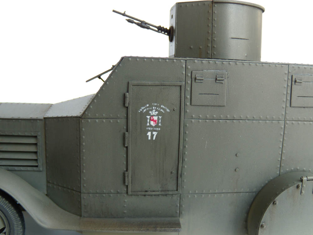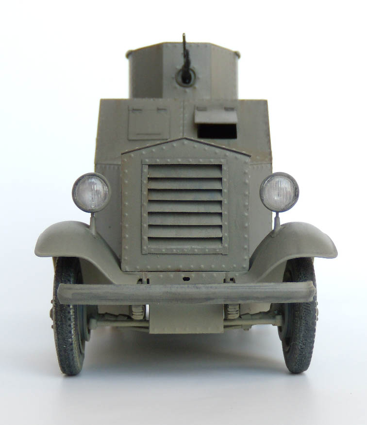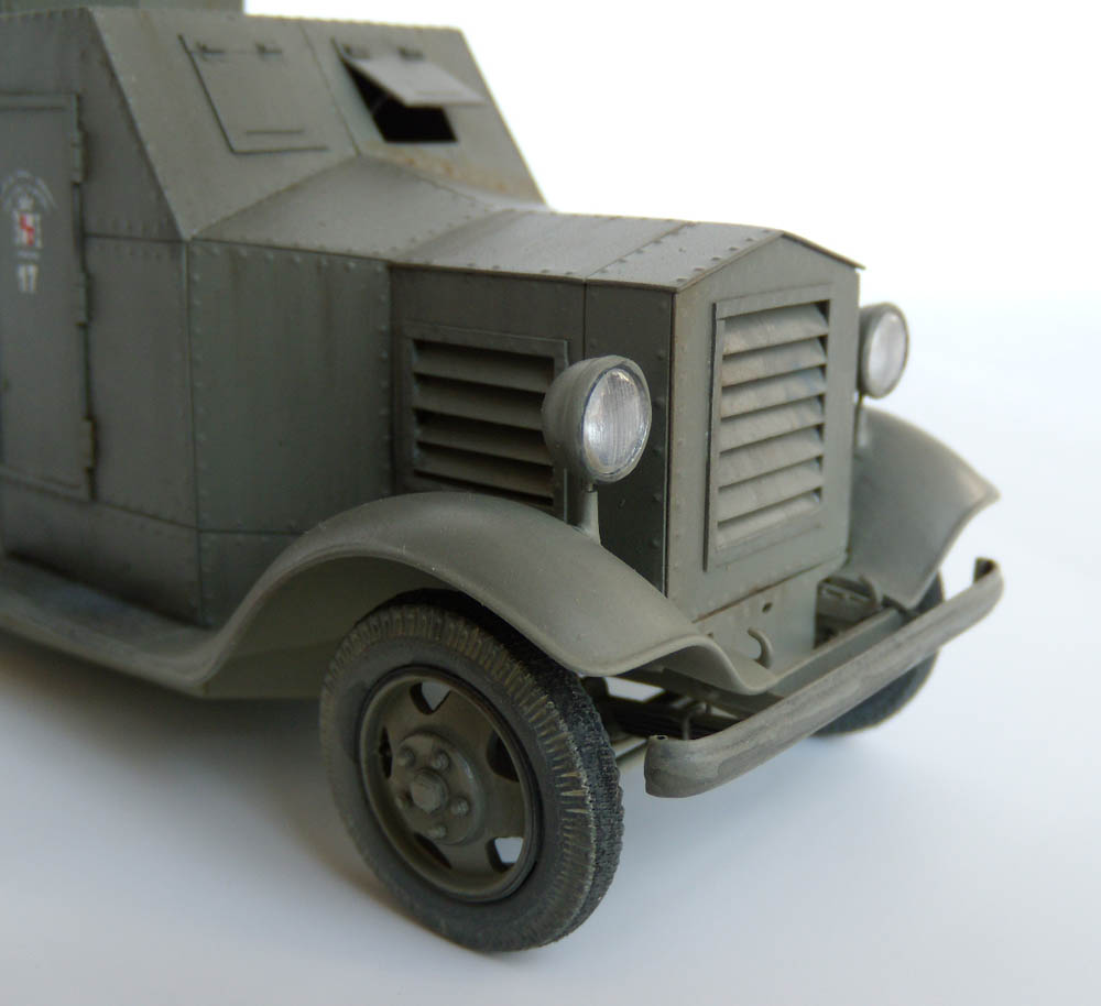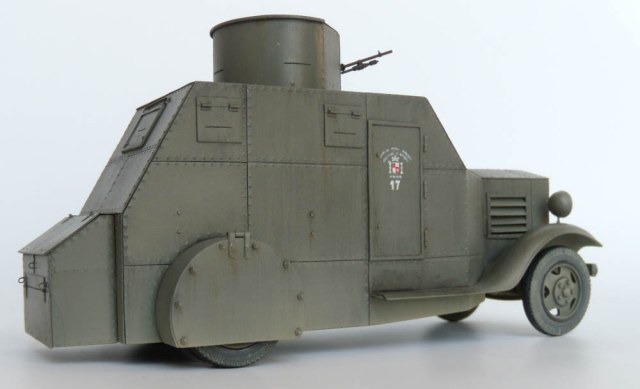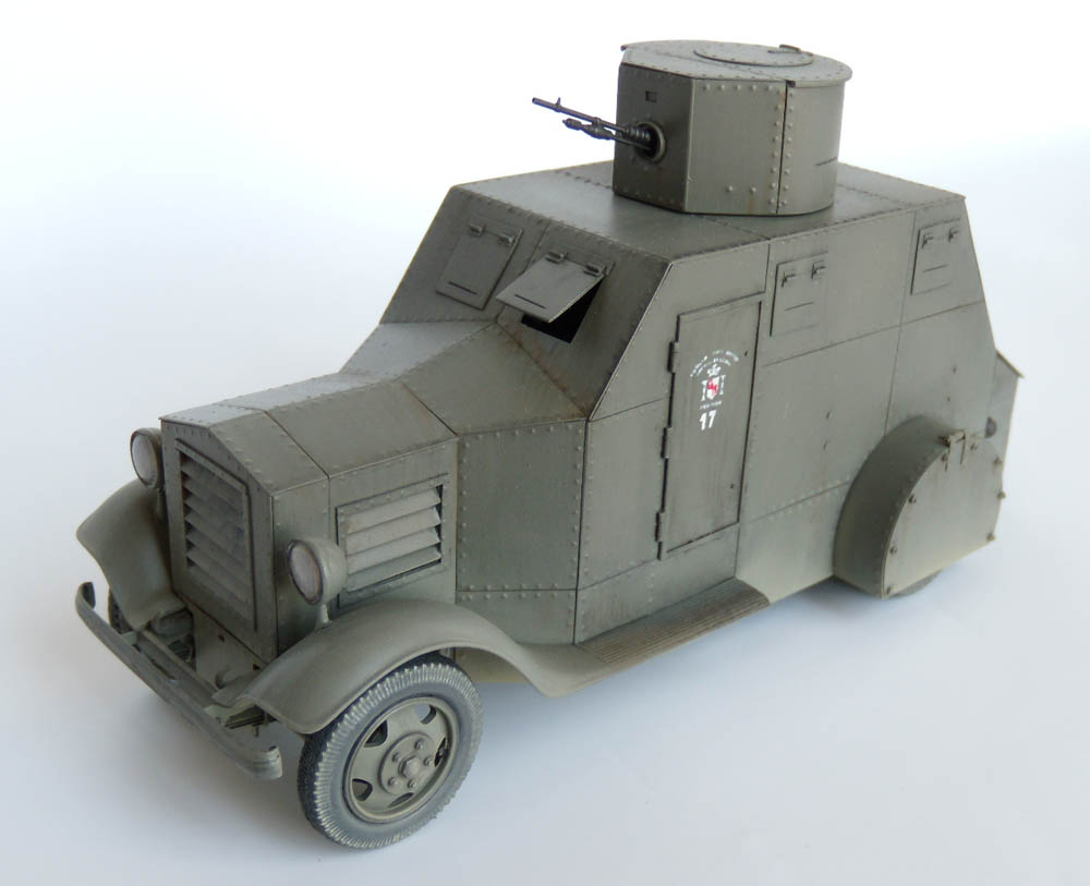 Модель строилась с использованием колес и рамы от звездинских броневиков. Бронекорпус из листового полистирола. Заклепки имитировались выдавливанием затупленной иглой на тонком полистироле (0.3 мм), впоследствии листами с выдавленным клепом оклеен весь корпус. Пулемет из иголок от шприца, проволоки и полистирола.