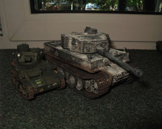 На модели у Вас установлена какая-то жёлтая штука на левом крыле спереди - это огнетушитель? Там бы крепёж заменить на полоски фольги. И если есть возможность, чтоб совсем хорошо - глушак заставить не блестеть, а выхлопную трубу рассверлить потоньше. На верхнем кормовом листе какие-то волны запечатлелись - сразу за башней, то-ли наплыв краски, то-ли следы клея.
