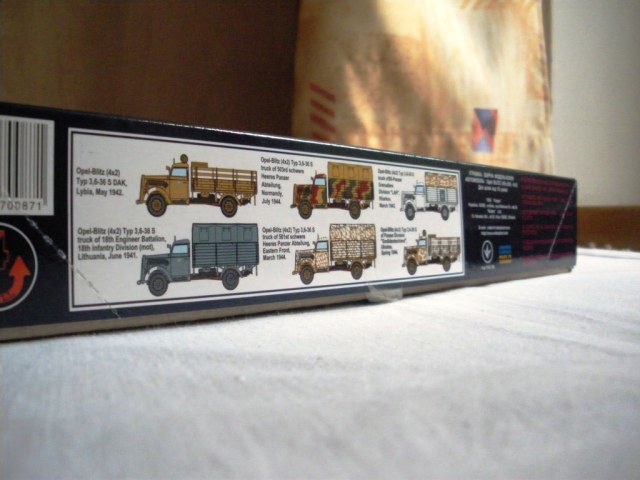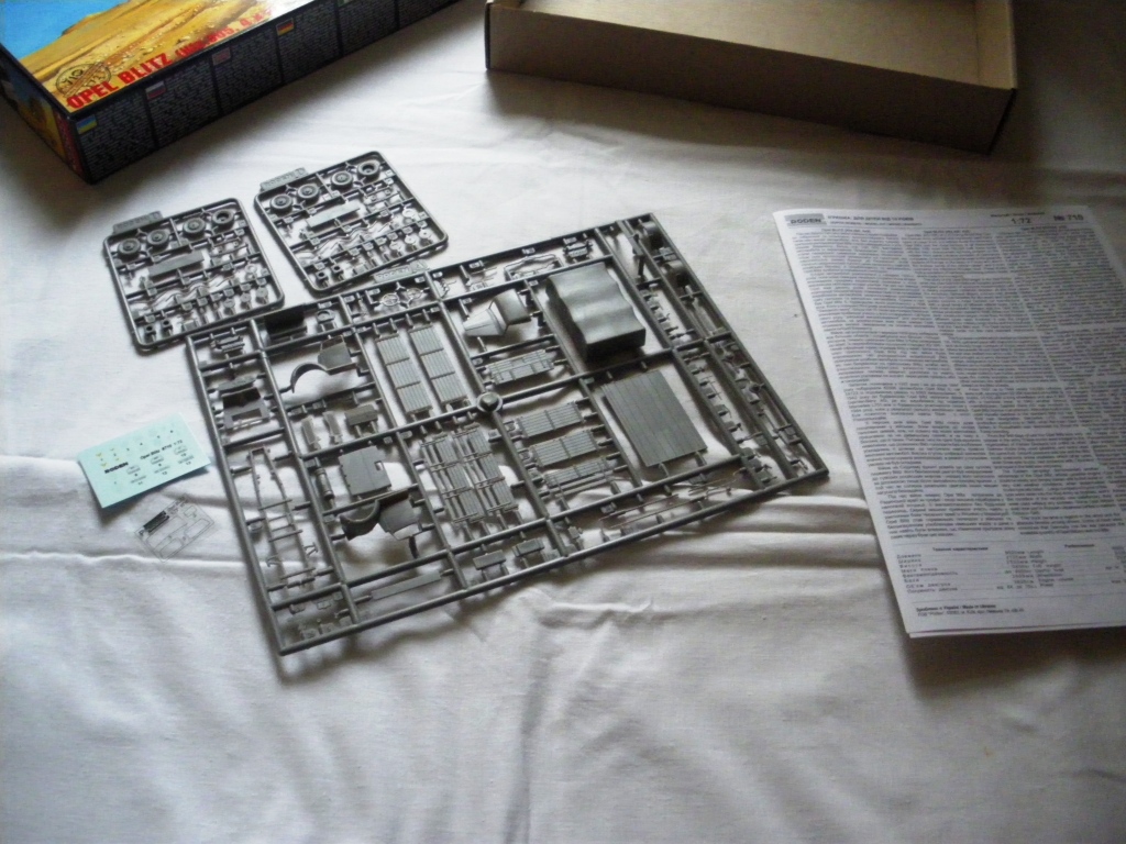 Коробка. имеет интересную картинку, водитель грузовика видимо втопил педаль газа осознавая, что его гробом станет обгоревший грузовик, а клатбишем пустыня, если он не спрячется где-нибудь от самолёта. На коробке также цветные схемы окраски.