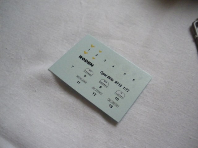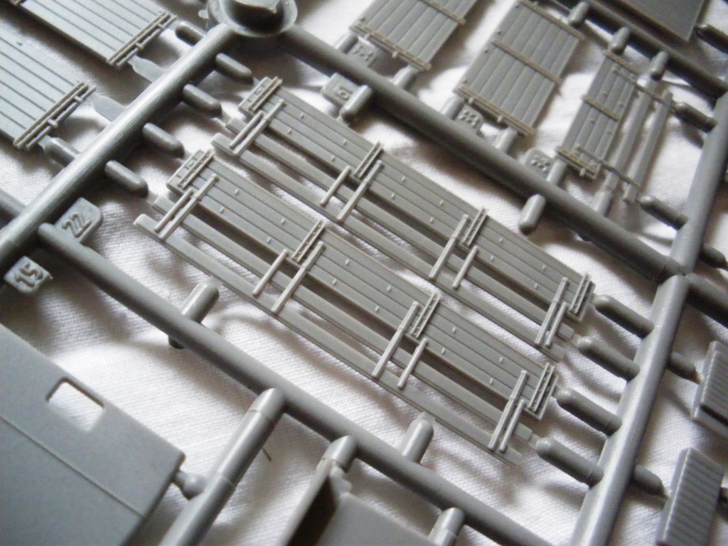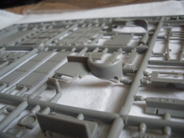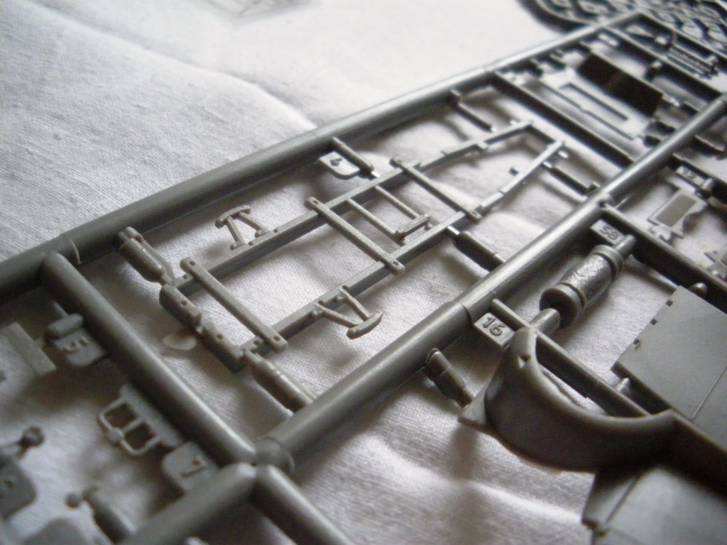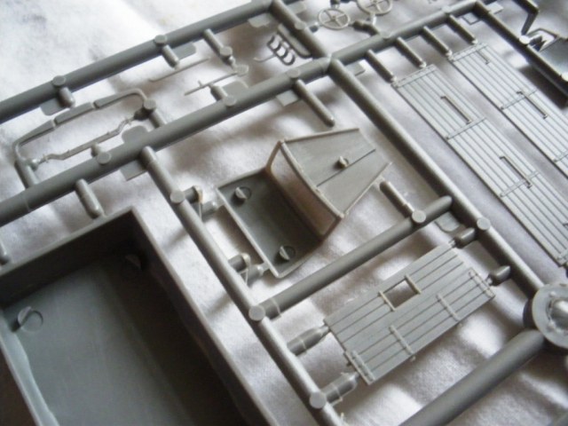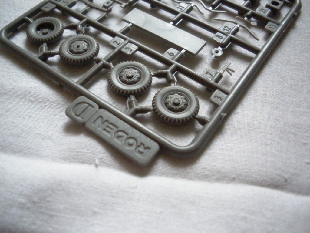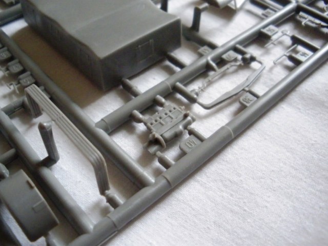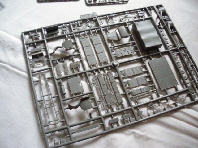 Литники. качество неполхое даже очень, детализация высока (на решётке можно рассмотреть натпись Opel Blitz), кузов тоже не плох можно разглядеть даже болты крепления. Большой литник имеет детали кабины и кузова, два маленьких - колёса и подвеска. Дефекты: есть немного облоя в окнах и нишах колёсных арок. следы от толкателей там где их незаметно в остальных не так трудно исправить.