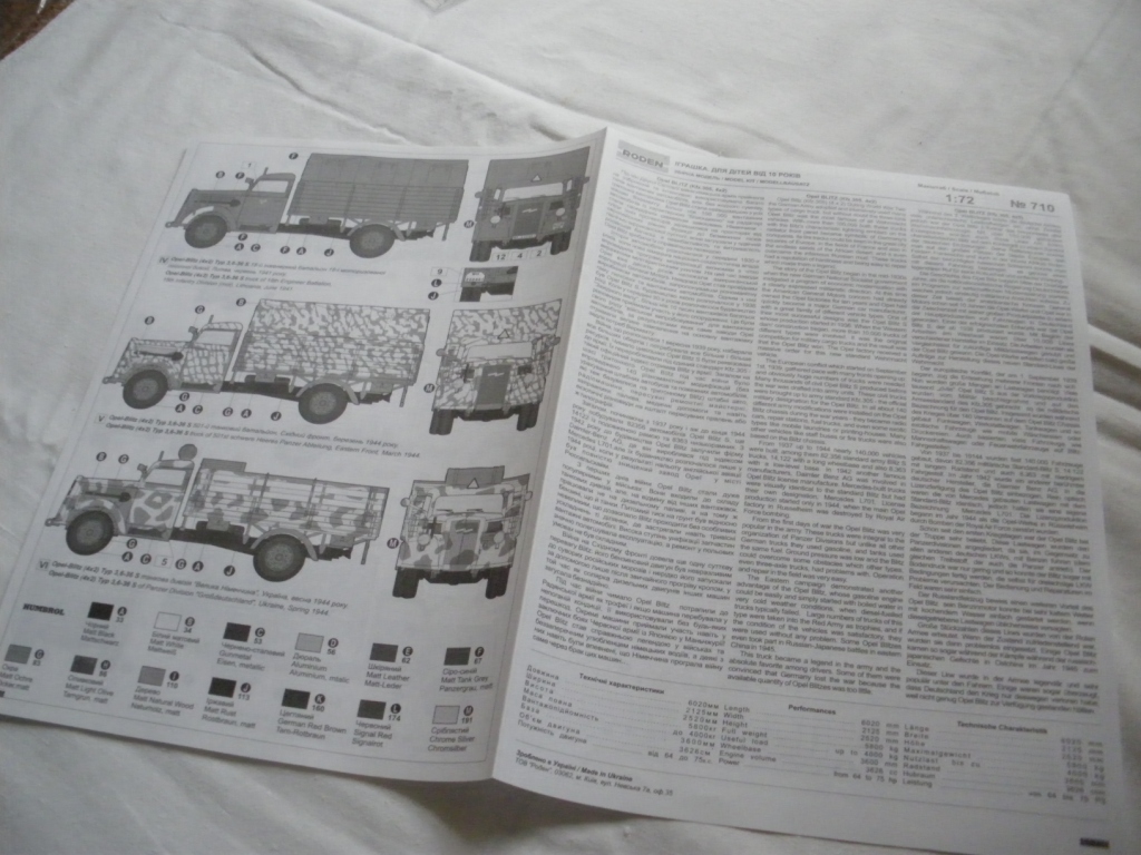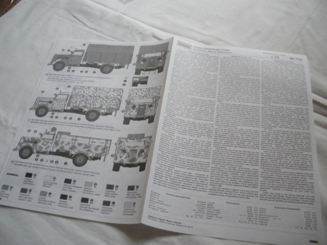 Инструкция представлена двумя листами формата А3 сложеными попалам. Окрасить модель предлагают в шесть разных окрасок практически всех театров действий и годов. Также можно сделать 2 варианта кузова (с высоким или низким бортом) и 2 варианта тента (сложеный или поднятый)