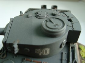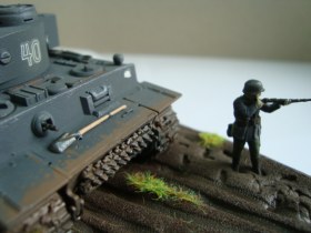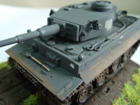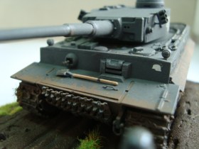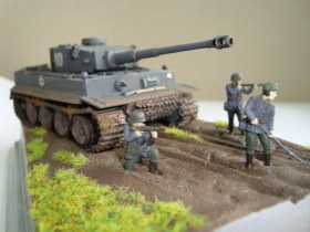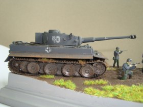 Этот "Тигр" я собрал задолго до того, как в продаже появился такой же от "Звезды". Поскольку в нашей местности ничего кроме "Звезды" и "Моделиста" не увидешь, сравнивать было не счем. У "Моделиста", как оказалось, деталировка примитивней, особенно меня удручала цельнолитая ходовая часть. Поэтому, чтоб замаскировать ее я решил добавить грязи. Само собой пришлось сделать подставку, рамка для нее была в наборе, азатем добавил саперов от "Звезды". Красил нитрой от "Моделиста", супер и акрил от"Звезды"