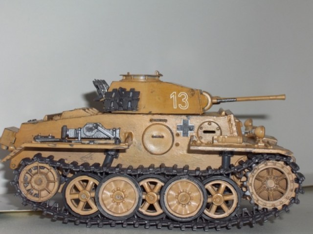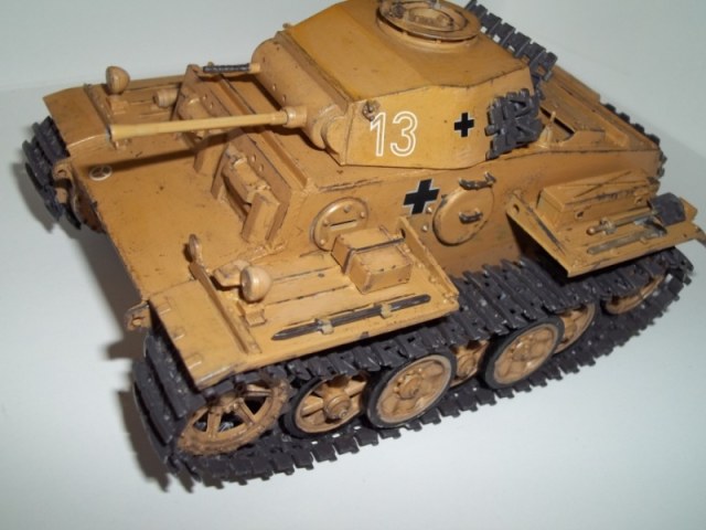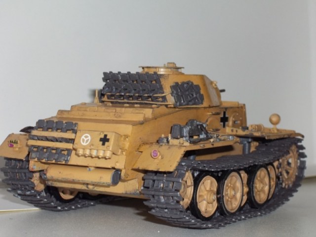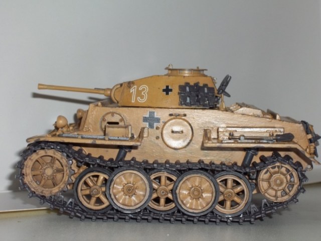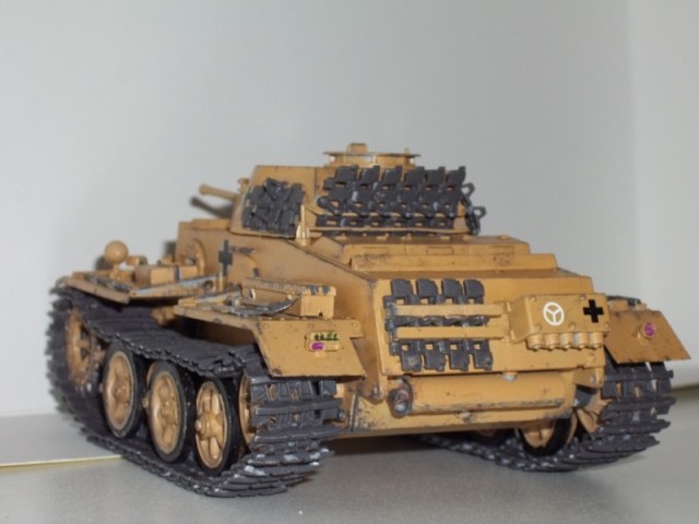 Работа оставляет двоякое впечатление: с одной стороны немного неряшливая работа (особенно видна на окраске бандажей катков), с другой усердная попытка в изображении мелочей - т.к. ржавчина на броне. Простых модельных "ухищрений" автор не применил, хотя и можно было и модель сразу бы приобразилась.Главным недостатком - бросающимся в глаза это то, что машина состоит из двух основных цветов: песочного и серо-чёрного.При этом гусеницы уж точно не бывают такого цвета и машина начинает смотреться как игрушка. Вообщим если советовать, то следующее: перекрасить гусеницы; пройти по модели смывкой и сухой кистью. Удачи и успеха!!!