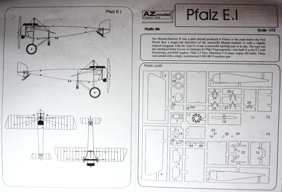 А выпущен он был вместе с Morane-Gи Morane-H, и представляет из себя один и тот же пластик, упакованный в разные коробки (если будете делать Pfalzи Morane-H, то нужно укоротить крылья на одну нервюру). Собирая аналогичный Пфальц, но другой серии хочу сказать, что собираемость средняя, пластик толстый и твёрдый, деталировка бедная, пулемёты лучше заменить, двигатели в принципе можно оставить.