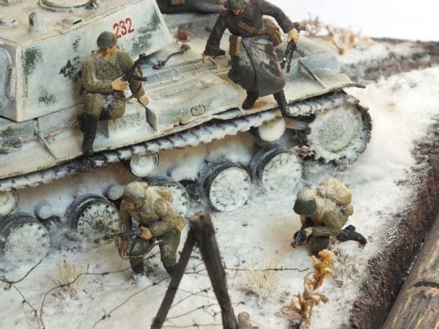 Здравствуйте,коллеги.Выкладываю свою первую диораму или виньетку.Собиралась она давно,когда о смывке и пигментах я и понятия не имел.Работа эта не галерейная,а просто хотелось услышать от вас,что можно было бы сделать по другому,и можно-ли переделать,что-то сейчас.Косяков конечно куча,начиная от гусянки и заканчивая голыми руками у бойцов.Про мат.часть КВ,я уже не говорю.Десант Тамия дает на 34-ку,так,что как мог расставил его на КВ. Красил кистью,белой эмульсионкой,правда от Бэккерс,акрил Звезда,остальное сода и ПВА.Подставка из строительного полиуританового утеплителя.В принципе,все.Сильно не плюйтесь.
