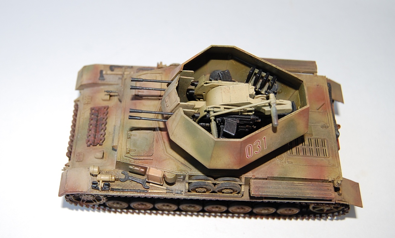 На влд щель, стволы в разные стороны, рассверлить их можно постараться (1/72 - кун). Конвойные огни, гребни гусей, ну и просто изкоробочные огрехи. Камок хорошо нанесён, боевое отделение акуратно покрашено.