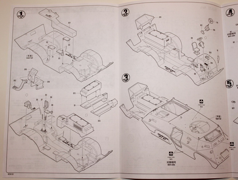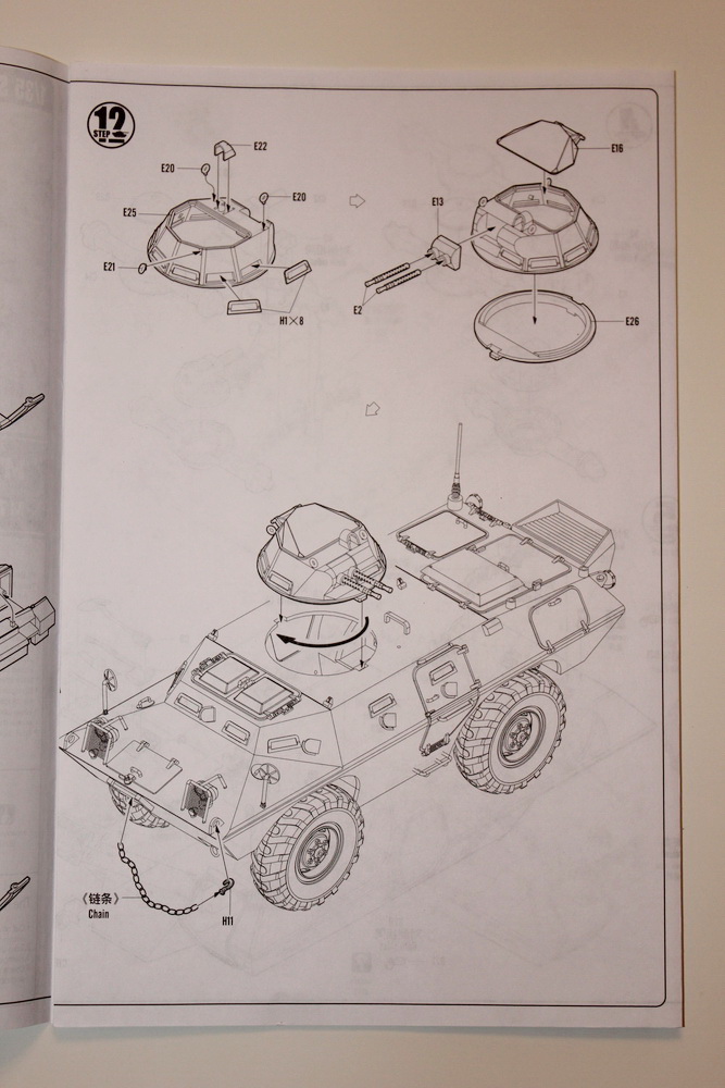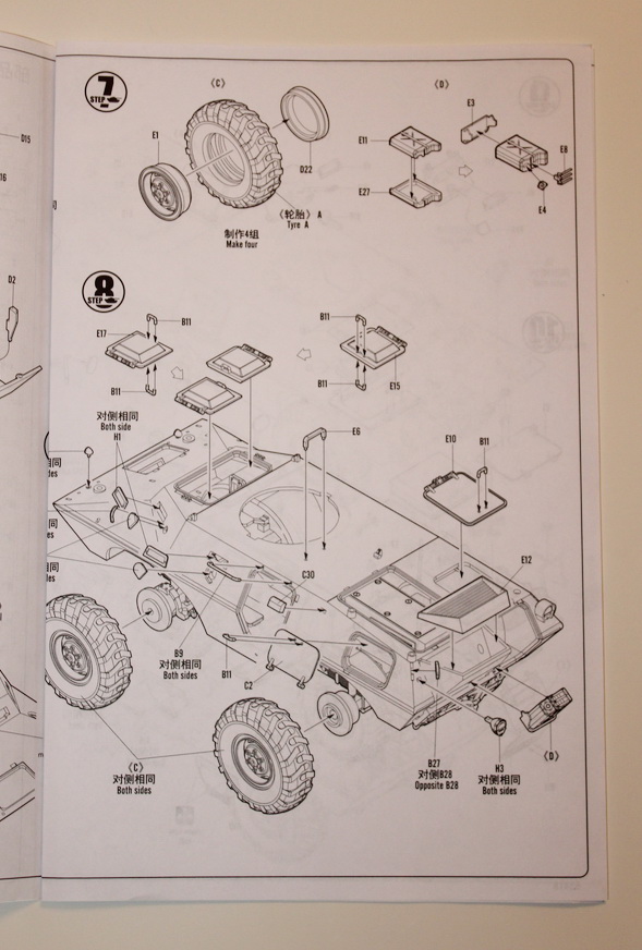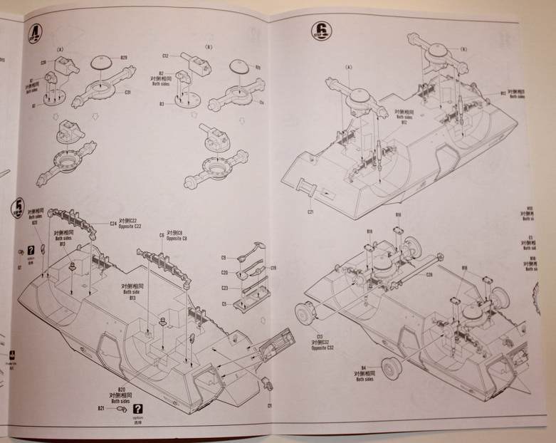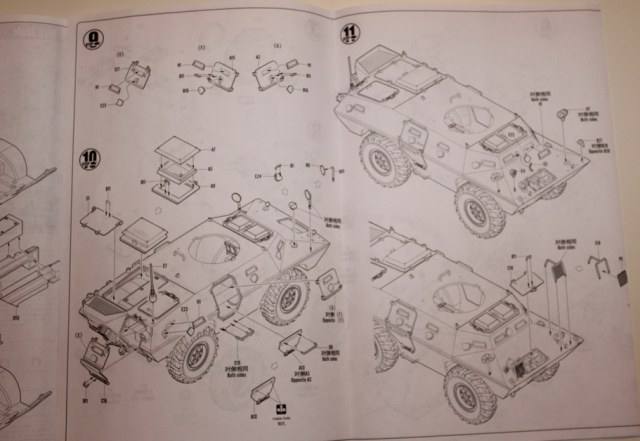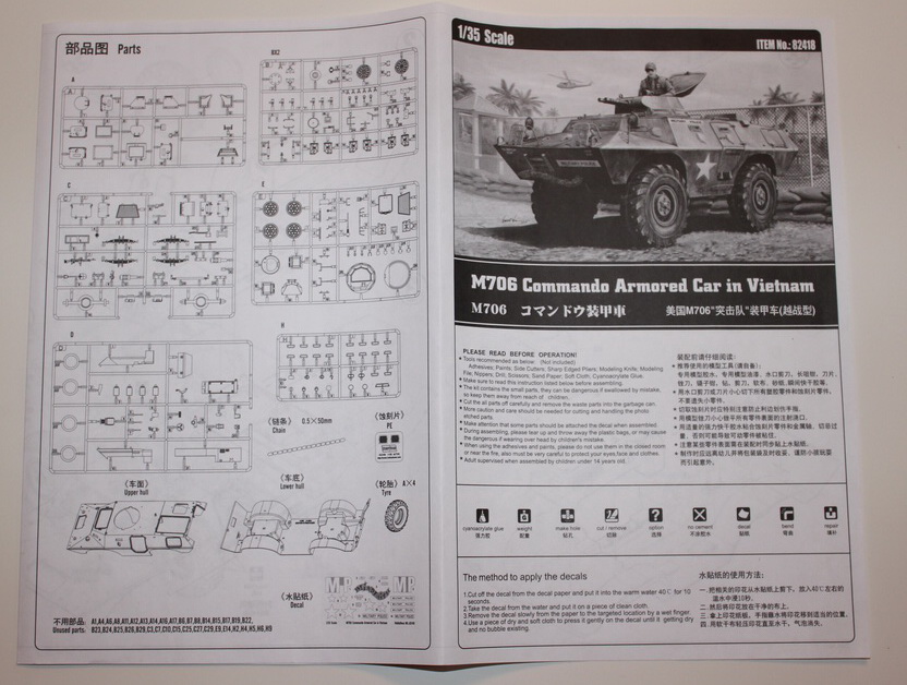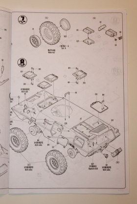 И так, что в коробке? Мы имеем яркую коробку средних размеров, из тонкого картона, в которой находится 6 литников серого цвета самого БТРа, 1 литник остекления, 4 колеса, маленькая платка травления с сетками и цепь, неплохая декаль на два варианта, и достаточно внятная и большая инструкция. Пластик, как уже сказал, серого цвета, стандартный для китайских производителей.