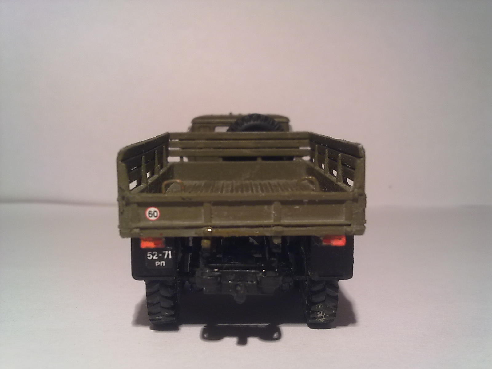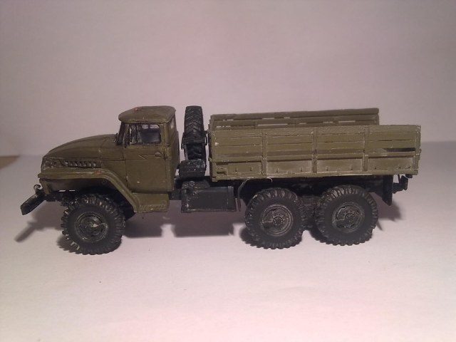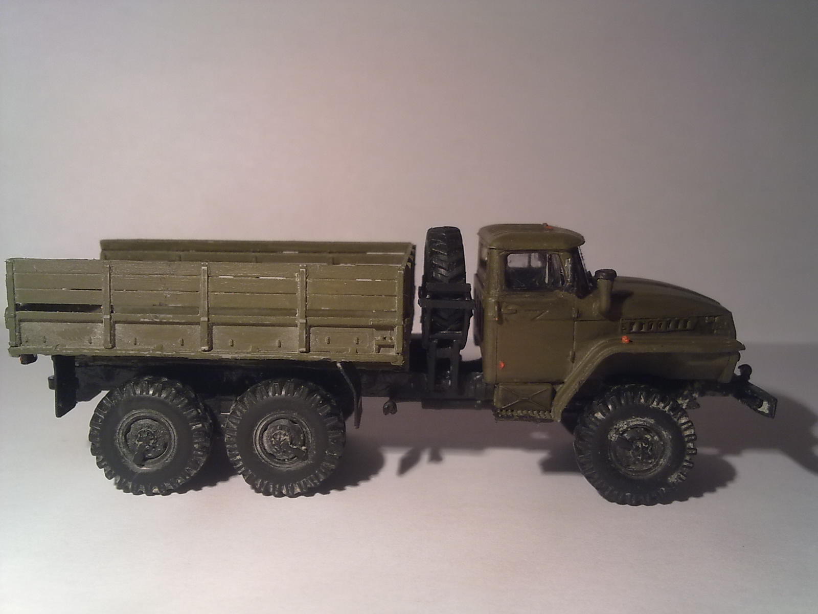 72 не мой размер, в подробности не вдаюсь, но на Урале не хватает подножек идущих от переднего бампера к крыльям кабины. Из-за этого проглядывают колеса и отмечается некая "кургузная подрезанность" машины)). Не думаю, что надо было его весь пачкать, достаточно чуть низа.