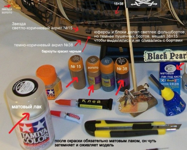 Краски использовал акриловые матовые "Звезда", "Акан", "Ревел", матовый лак "Ревел" и "Тамия" (в баллончике). Все красил кистью. Паруса грунтовал и красил из баллончиков краской для пластика из хоз магазинов.