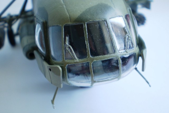 Собиралась модель очень легко, правда местами пришлось убирать некие непонятки с литьем, не знаю даже как их обозвать. В небольших количествах использовал шпаклевку (хвостовая балка, места стыковки капотов двигателей, немного на «брюхе» и створках), но количество её не было критическим. Понравилось то, как производитель дает остекление кабины, само членение. И кажется мне, что оно более корректно, нежели то, которое дает «Звезда».