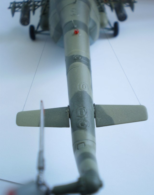 Разочарованием было то, что наши китайские друзья в наборе обошли вниманием фермы и балочные держатели для вооружения. Поэтому, почесав затылок, взял их из набора «Ми-17 «Звезда», т.к. собираюсь делать его сугубо мирным, в окраске МЧС Украины. Из этого же набора, при помощи острого ножа, был акцептирован блок ЛТЦ и с почетом водружен на новое место. При помощи фольги – самоклейки попытался сделать хомуты при помощи которых он (блок ЛТЦ), крепится к хвостовой балке. Блоки Б-20 В8 (по-моему так они называються) из набора «Звезды», предварительно высверленные. Изготовил тросовые антенны из нити от капроновых колготок, установил електрожгуты на втулки НВ и РВ. Проблесковый маяк МСЛ-3 изготовил из зернышка красного бисера, украденного у жены (мне кажется что он немного больше чем надо). Установил БАНО на фермы БД и ХС-39 на хвостовую балку.