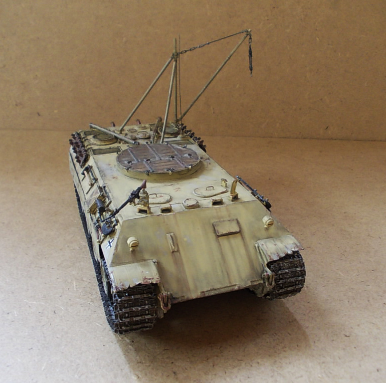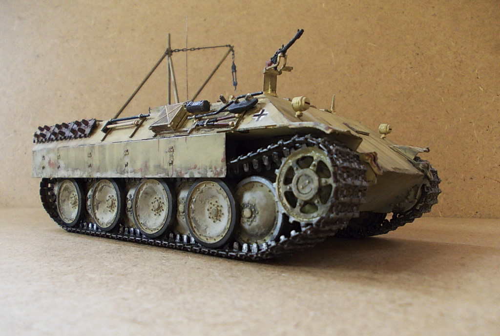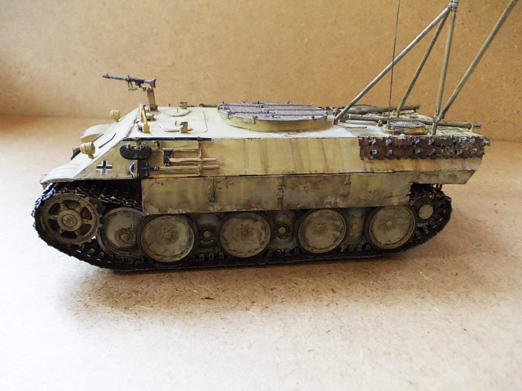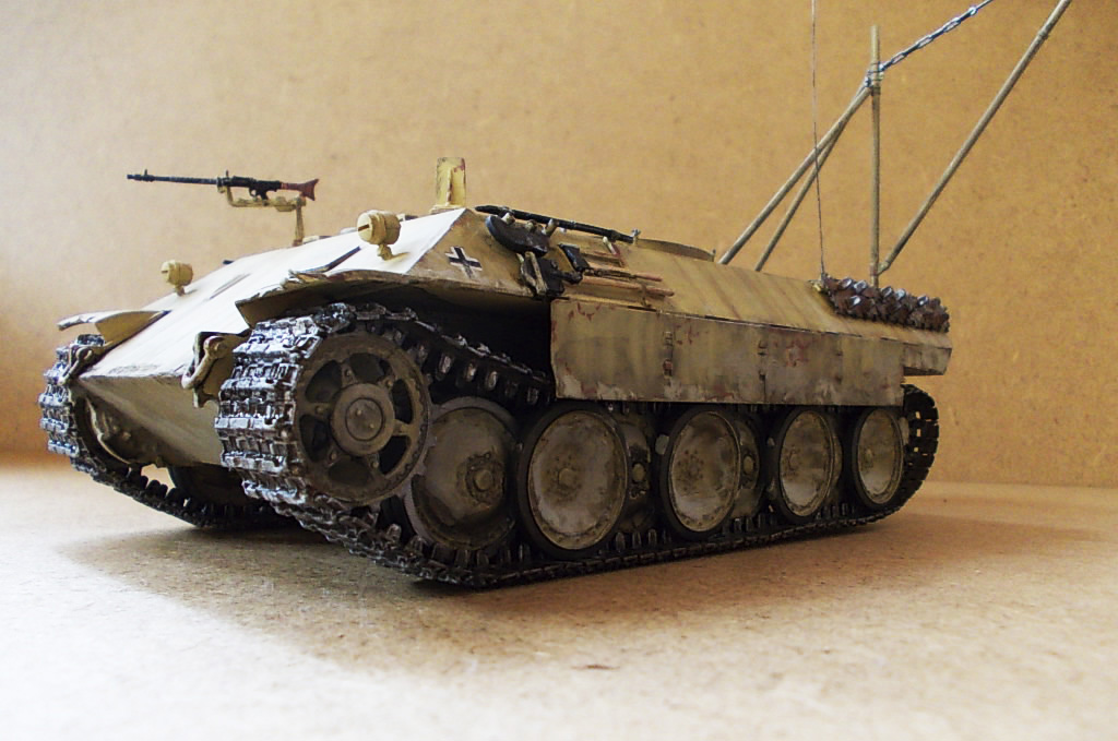 Андрей, хорошая получилась бремка, очень понравилась деревянная крыша. Возможно в жизни она действительно красилась, но на модели она выглядит очень симпатично. А вот сетки на МО вышли не совсем удачно. На прямоугольных решетках рамки не имели прямого угла - там стоял болт крепления, а круглые имели окантовку из прутка и не из пластины. Неплохо было бы в гребнях траков сделать прорези, или поменять на Мастерклуб.