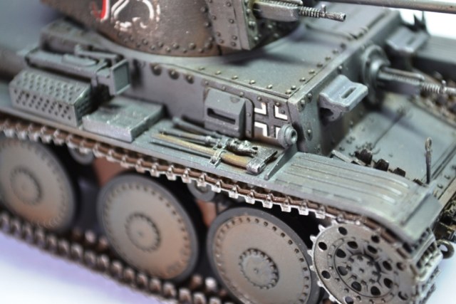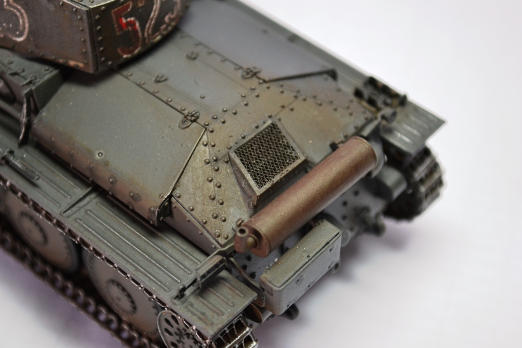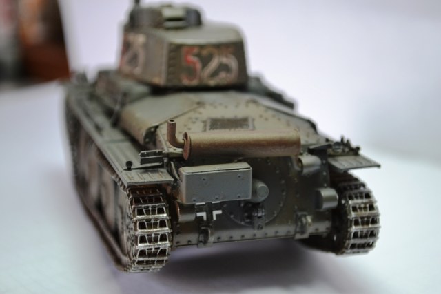 Приятная модель вышла. Хочу отметить хорошую работу "сухой" кистью, особенно по гусеницам и пулеметам. Надо бы немного доработать глушитель и чуть состарить изображение креста в корме, а то выглядит очень новеньким и чистеньким по сравнению с номерами на башне...