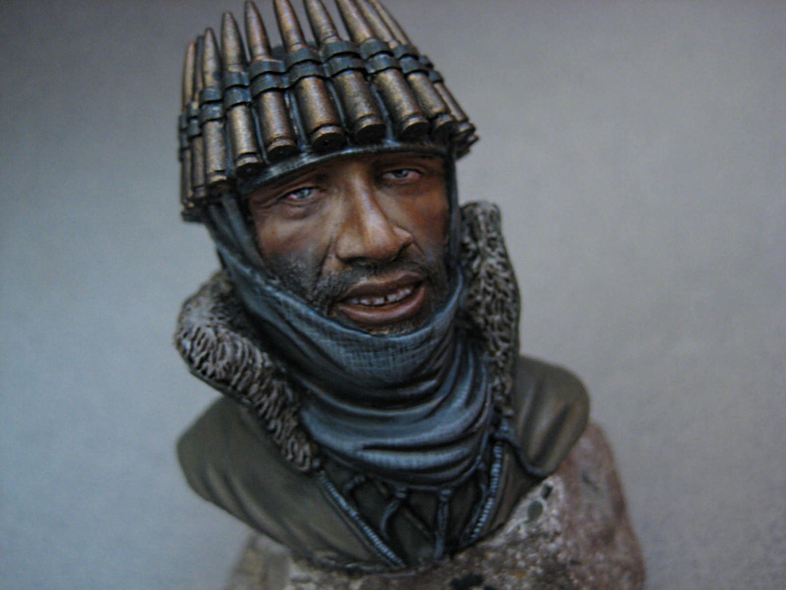 Блин ком-т пропал....понравилось...только если взять реальные патроны 12,7(50 калибр)- то он не смог бы шевелить головой долго...я насчитал около 20х150 грамм каждый=3кг...это к скульптору конечно...придурков много в африке....я на спор не смог поднять полную ленту от ДШК...пришлось волоком до ящика...