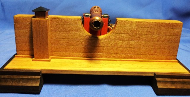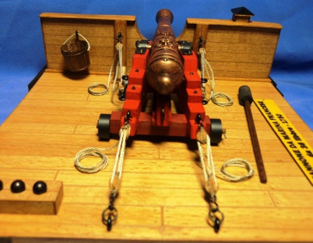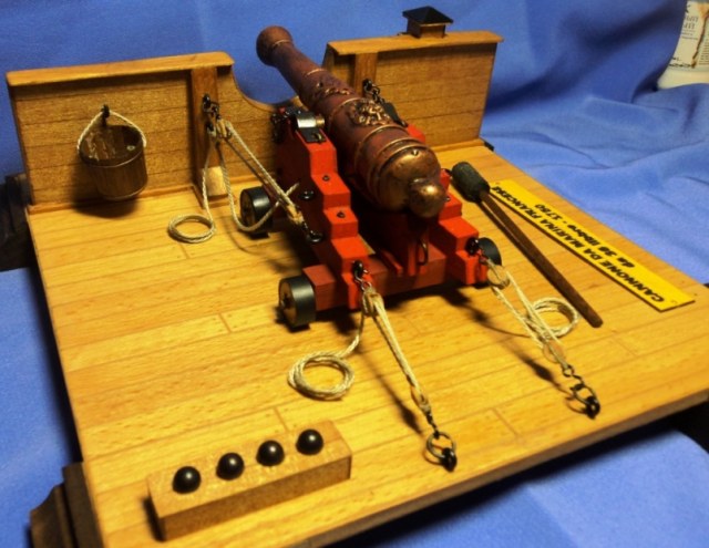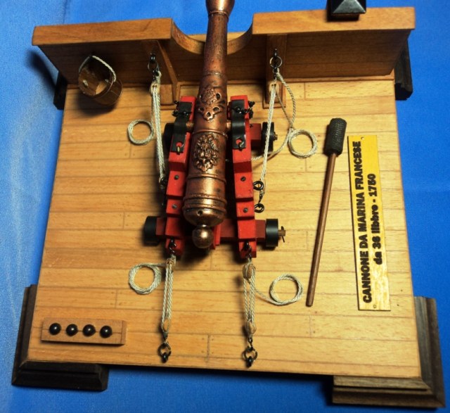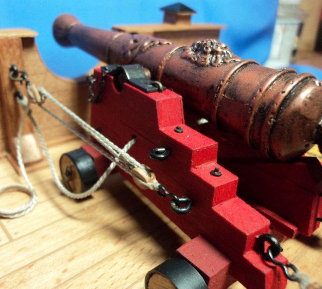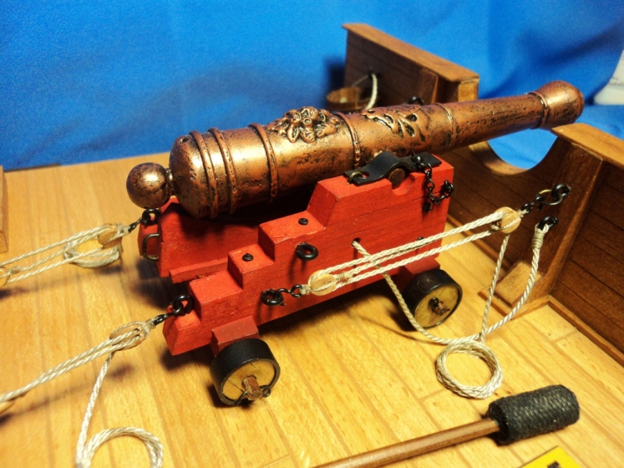 Да, Мантуя достоверностью не особо балует.Лафет дан аглицкий.Только брюк пропущен по французски.Только коротковат на мой взгляд.Должен позволять полный выкат из порта и еще немного свободного пространства.И потолще бы.А стволы у них/у мантуи/ ваще ужасные.И форма и эти с позволения сказать "украшения"...Такая толщина....Я эти стволы уже лет 20 вижу одни и те же.Собрано качественно.Не люблю красные лафеты,я бы сделал темно-коричневый.Еще блеск на ядрах,коушах,гаках.Кстати, легко убираемо матовым лачком.Чуть тронуть кисточкой.И брюк затемнить.А так работа вполне зачетная.Чуть -чуть дожать мантуевское .....и будет хорошо.