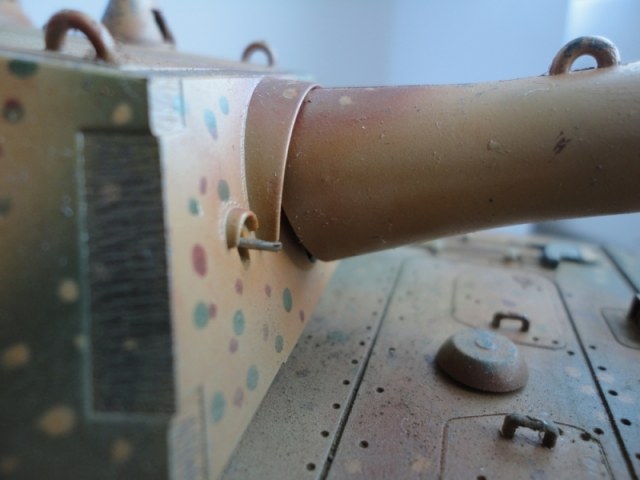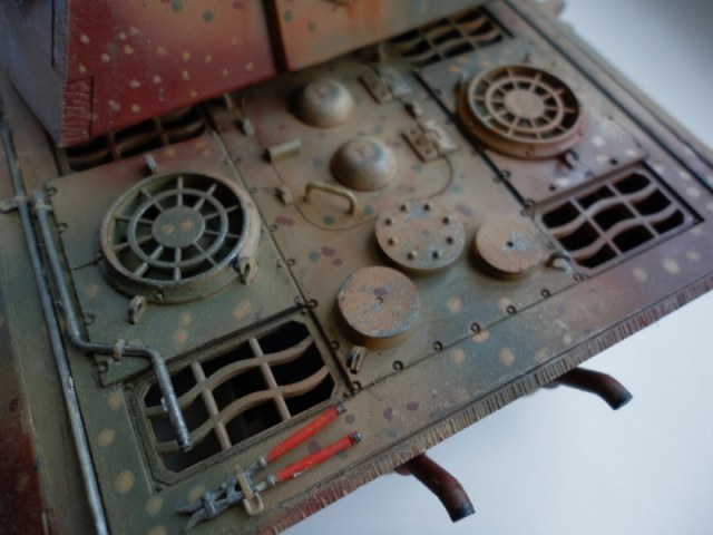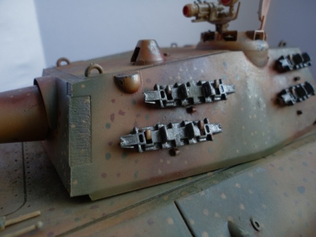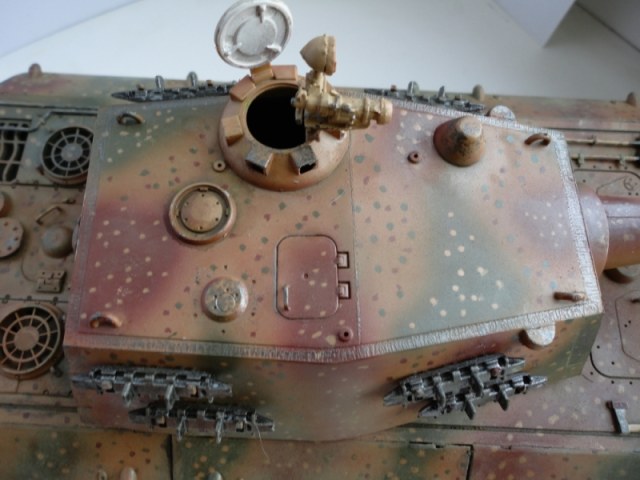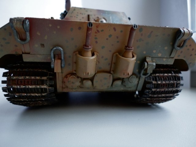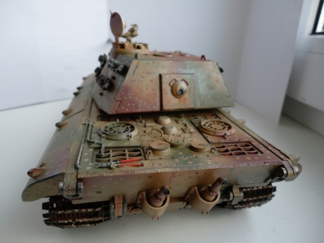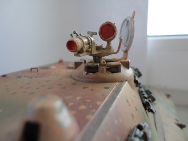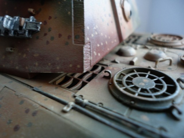 Результаты спешки автора- налицо. Сетки на МТО не поставлены -в результате пеустота отсека так и светится. ИК-прибор при таком исполнении лучше убрать вообще. Оптика, вернее, отсутсвие оной, не добаляет модели зрелищности. Также совсем непонятен черный ствол -по идее он должен быть окрашен в серый цвет термостойкой грунтовки. На самый крайний случай- в красно-коричневый. Увлечение металликом на гранях не добавляет реализма- если трете грани до металла, то трите карандашным грифелем, а не металликом. иначе потертость получается не "стальная", а "алюминиевая". Отсуствие следов эксплуатации также не добаляет реализма, но это уже на любителя.